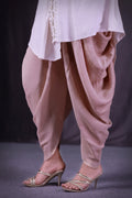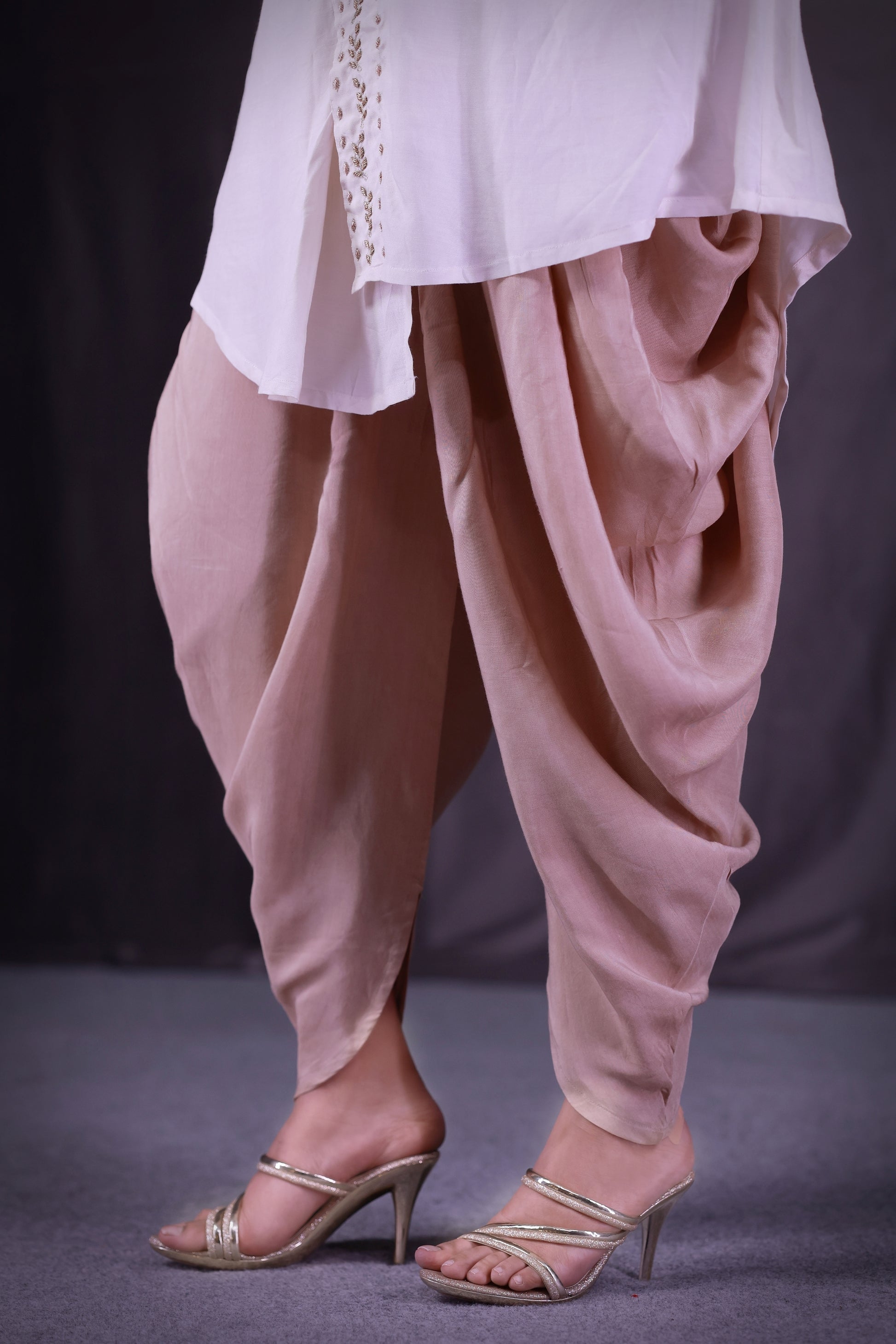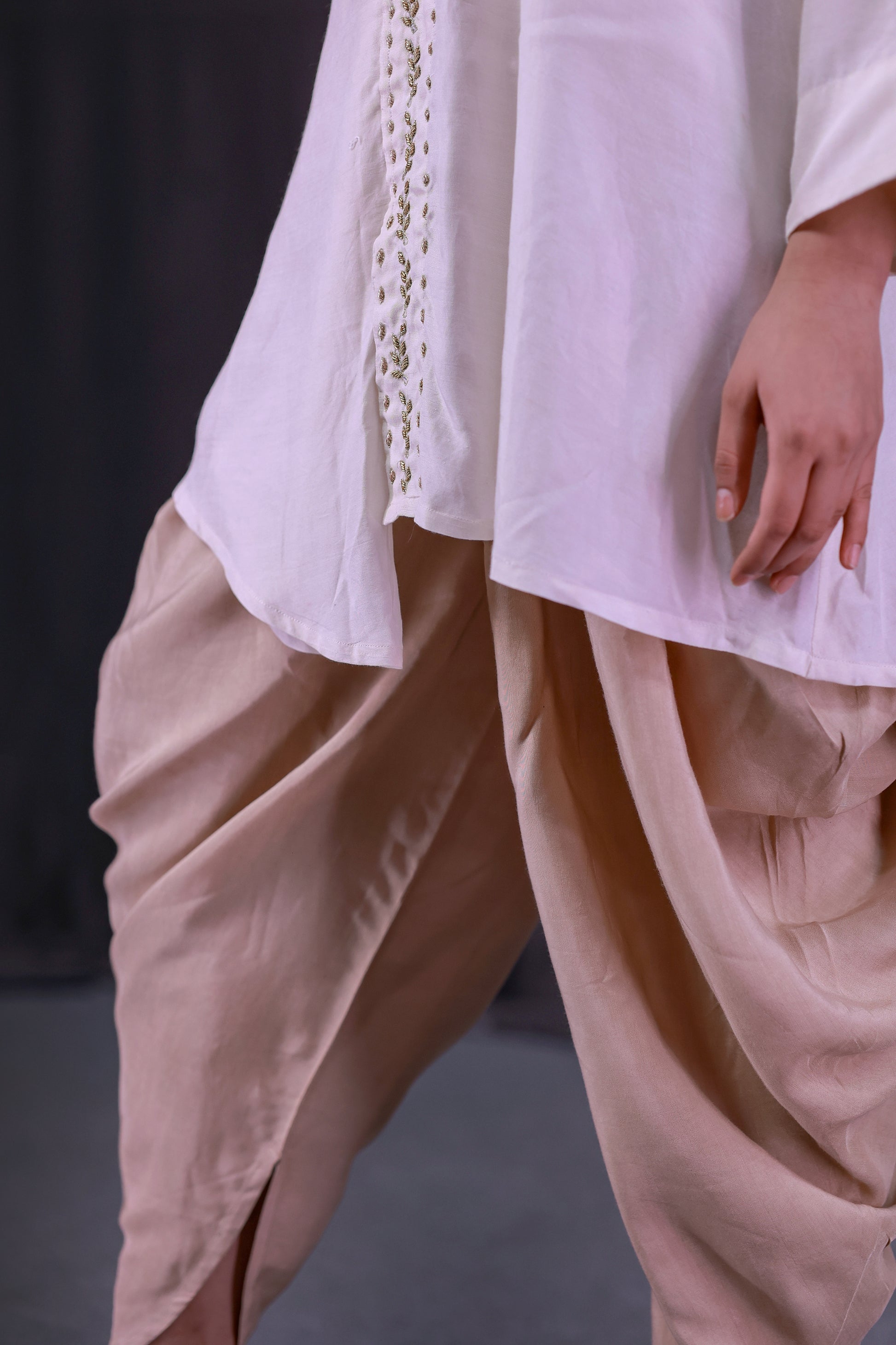 An off white Luxe Silk medium length shirt with a stylish overlap where one flap is longer, relaxed collar, and delicate vine embroidery in salma and dabka. Paired with a beige gold dhoti shalwar inspired by traditional Punjabi styling.