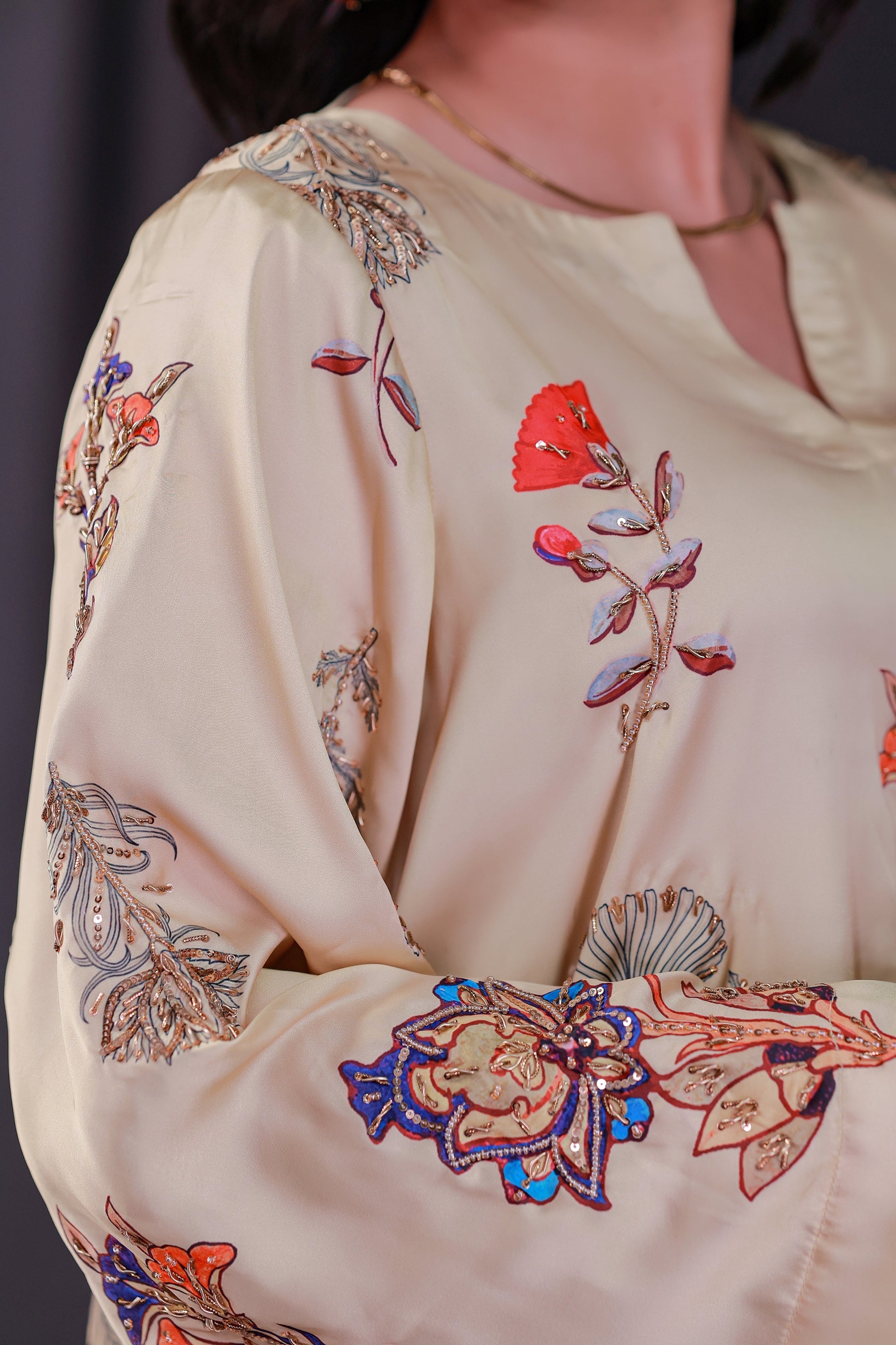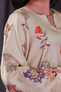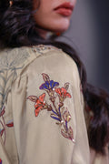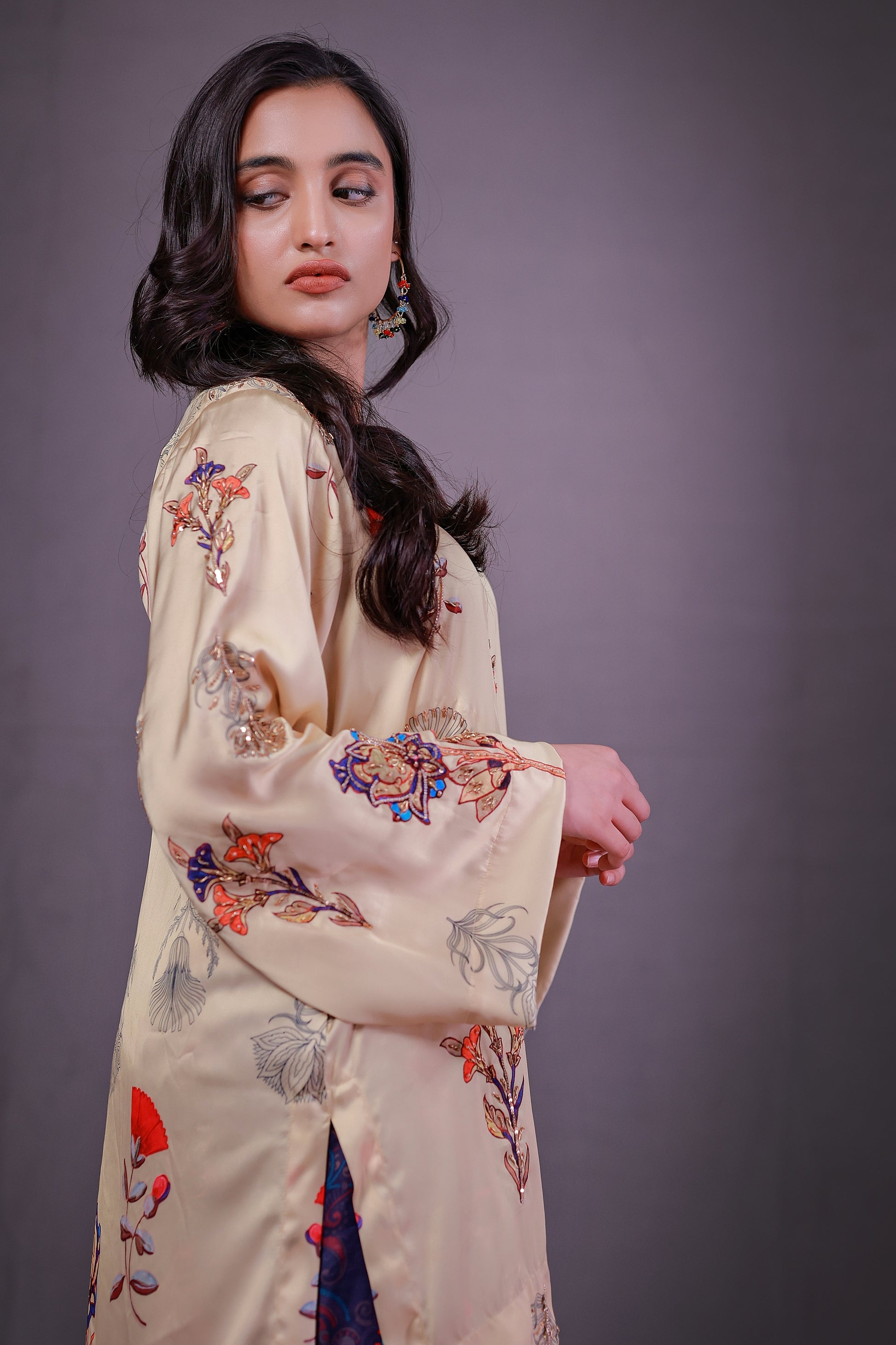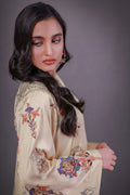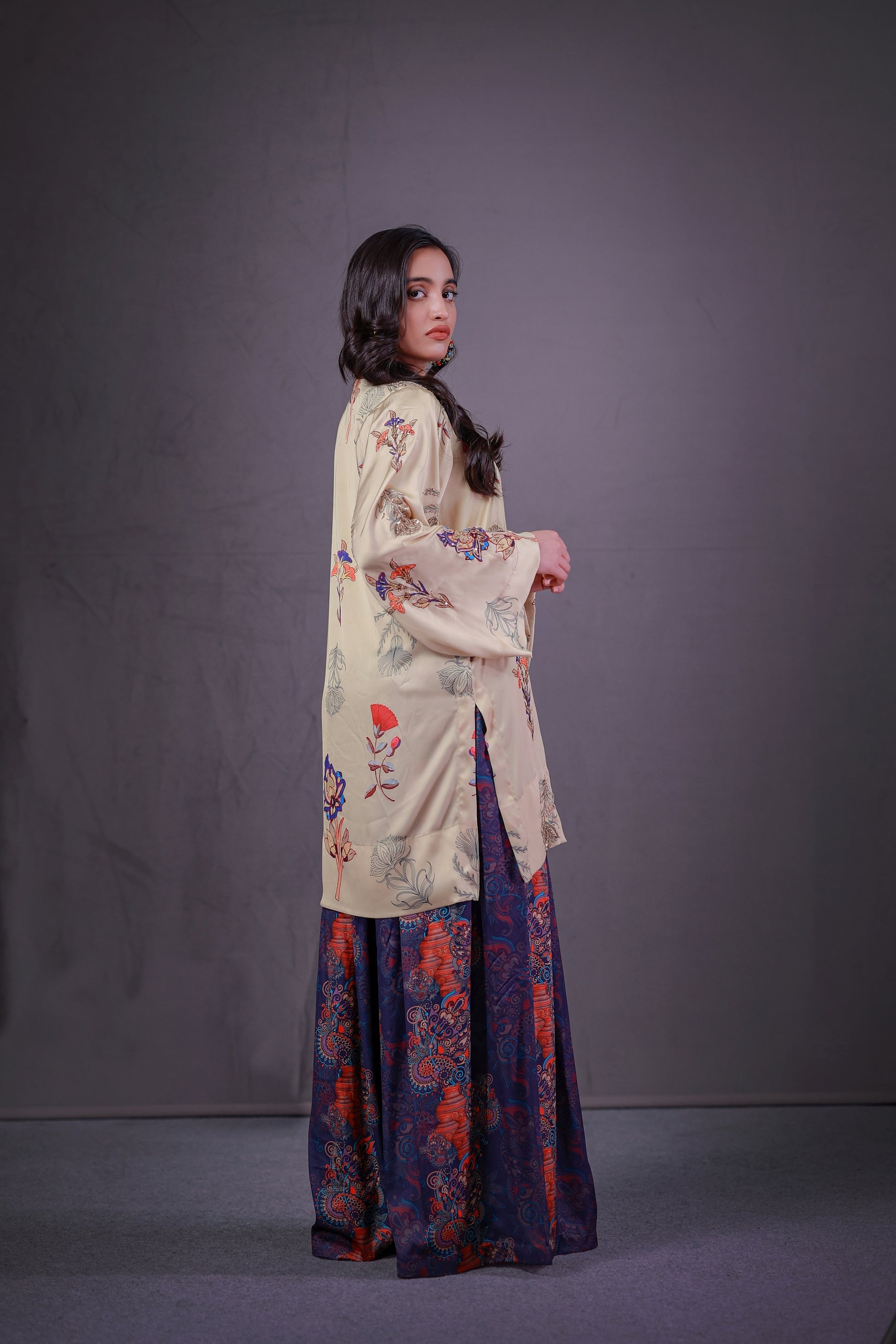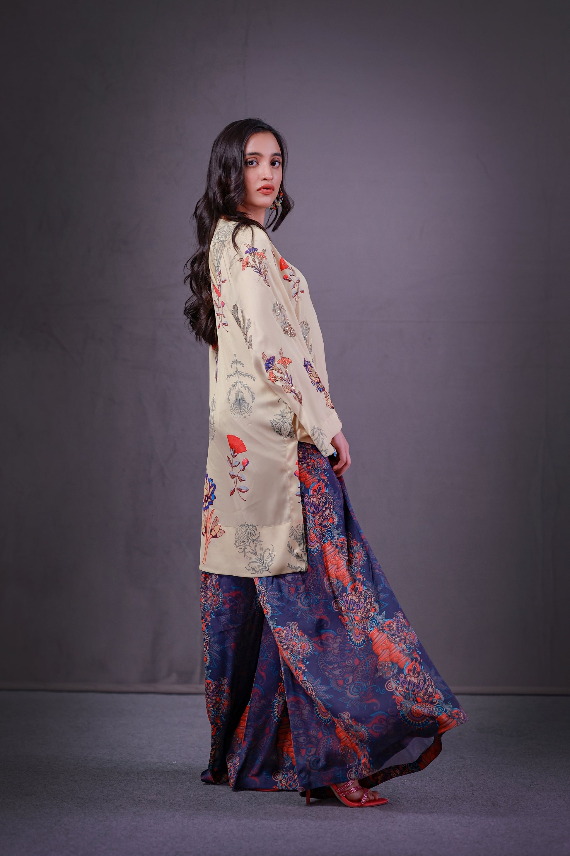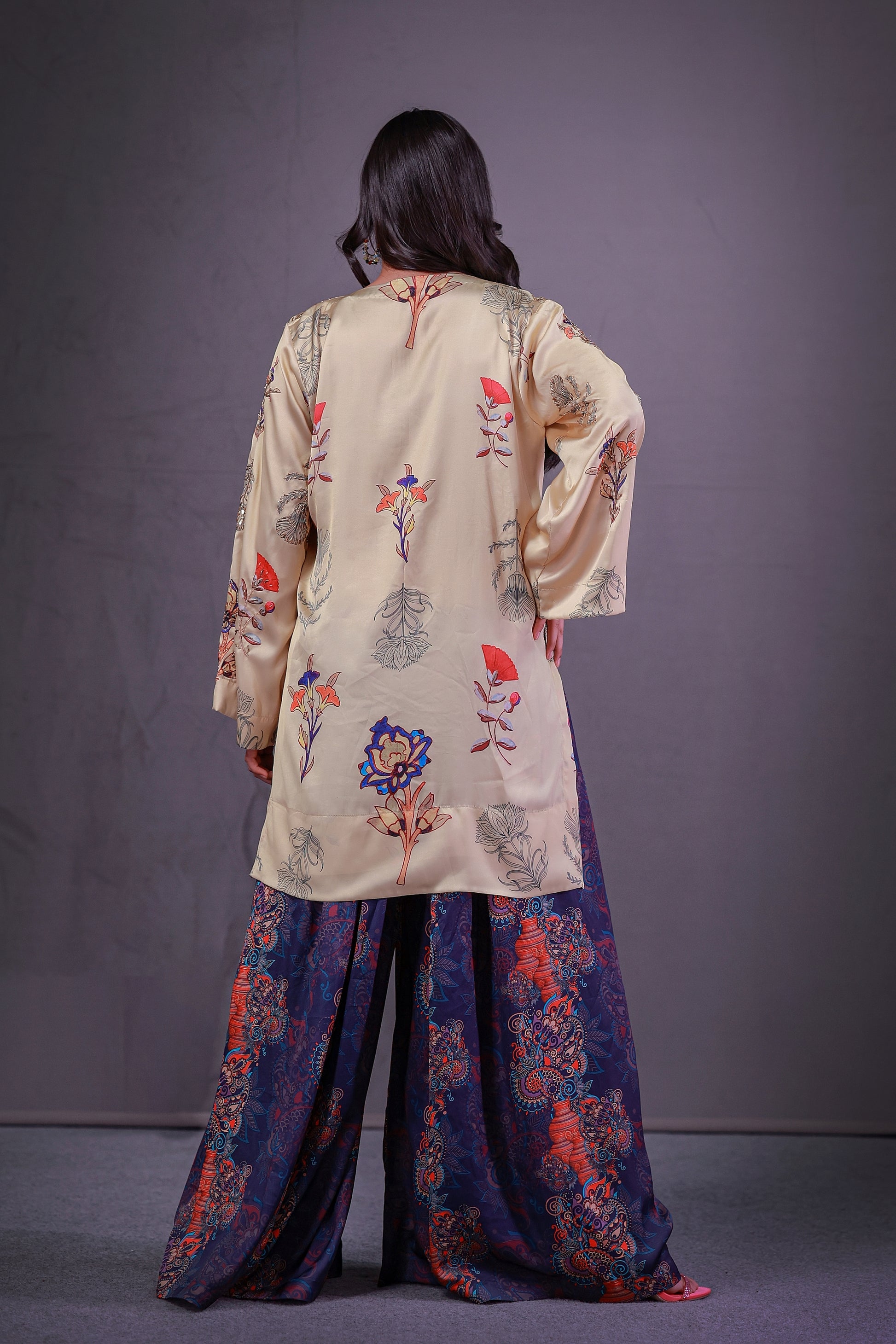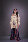Gold base shirt with beautiful adda work using dabka, salma, sitara and zardozi paired with deep plum trouser with digital printed matka motifs. Designed for parties and special occasions.