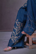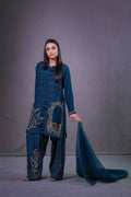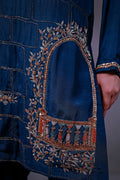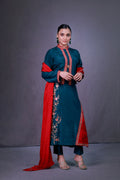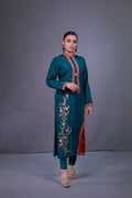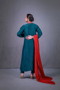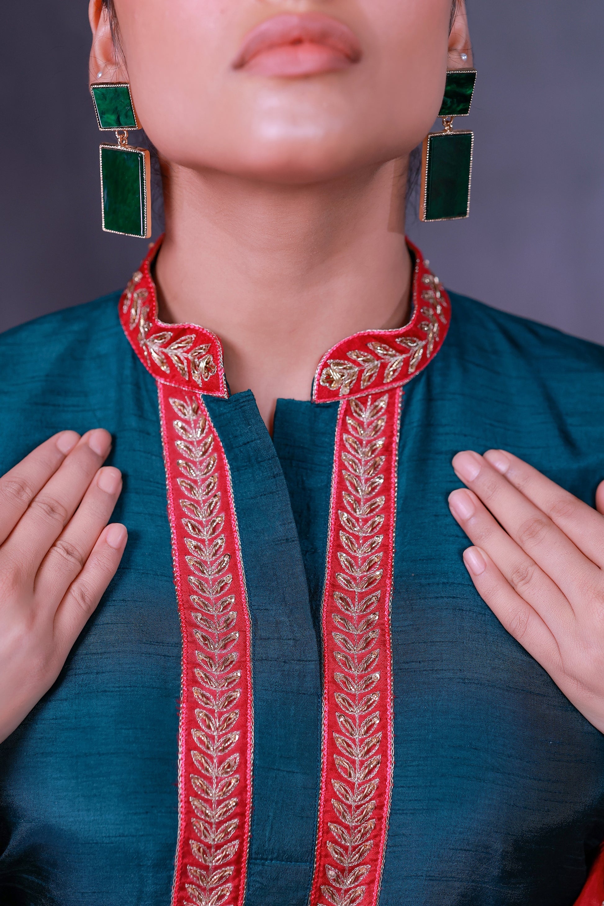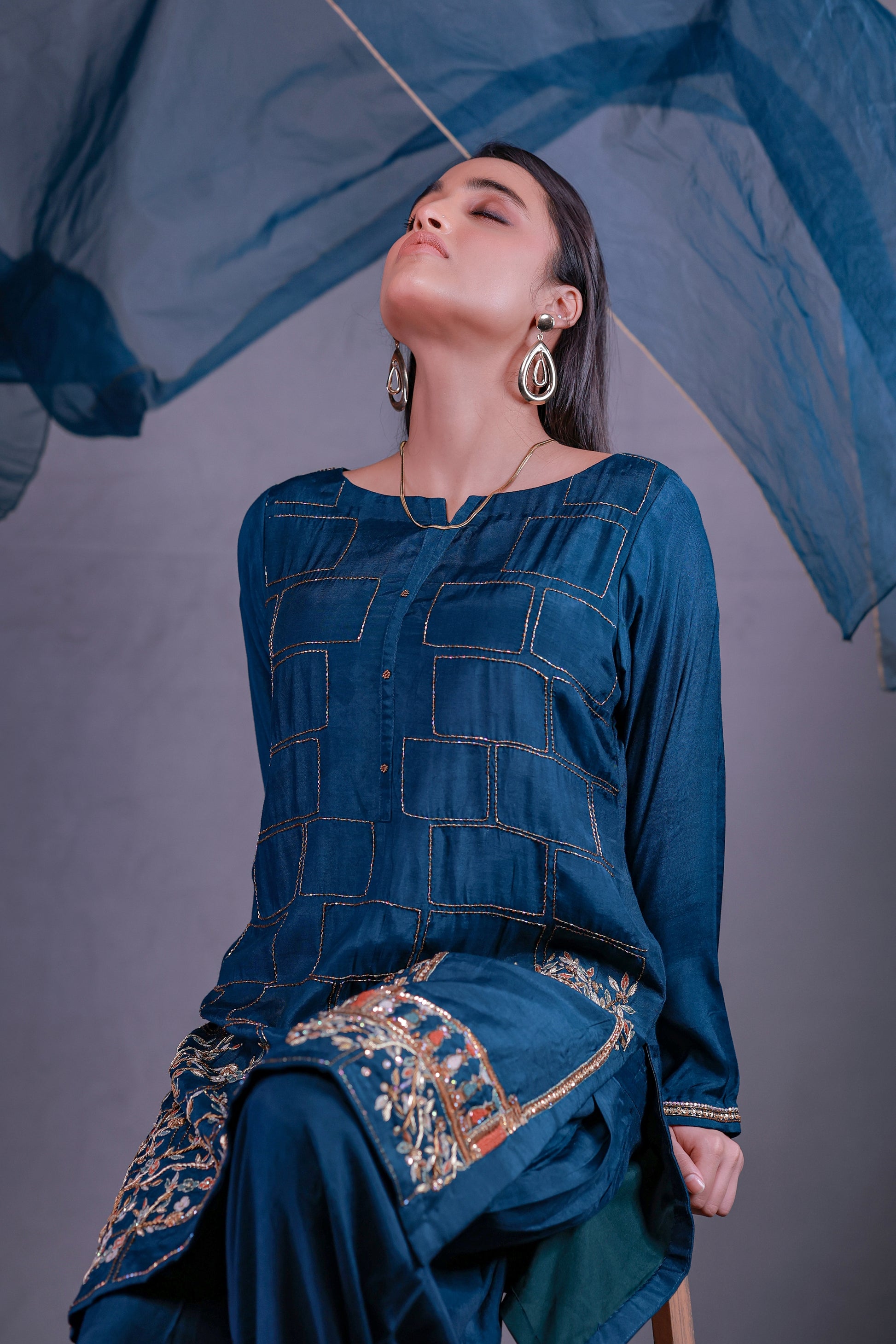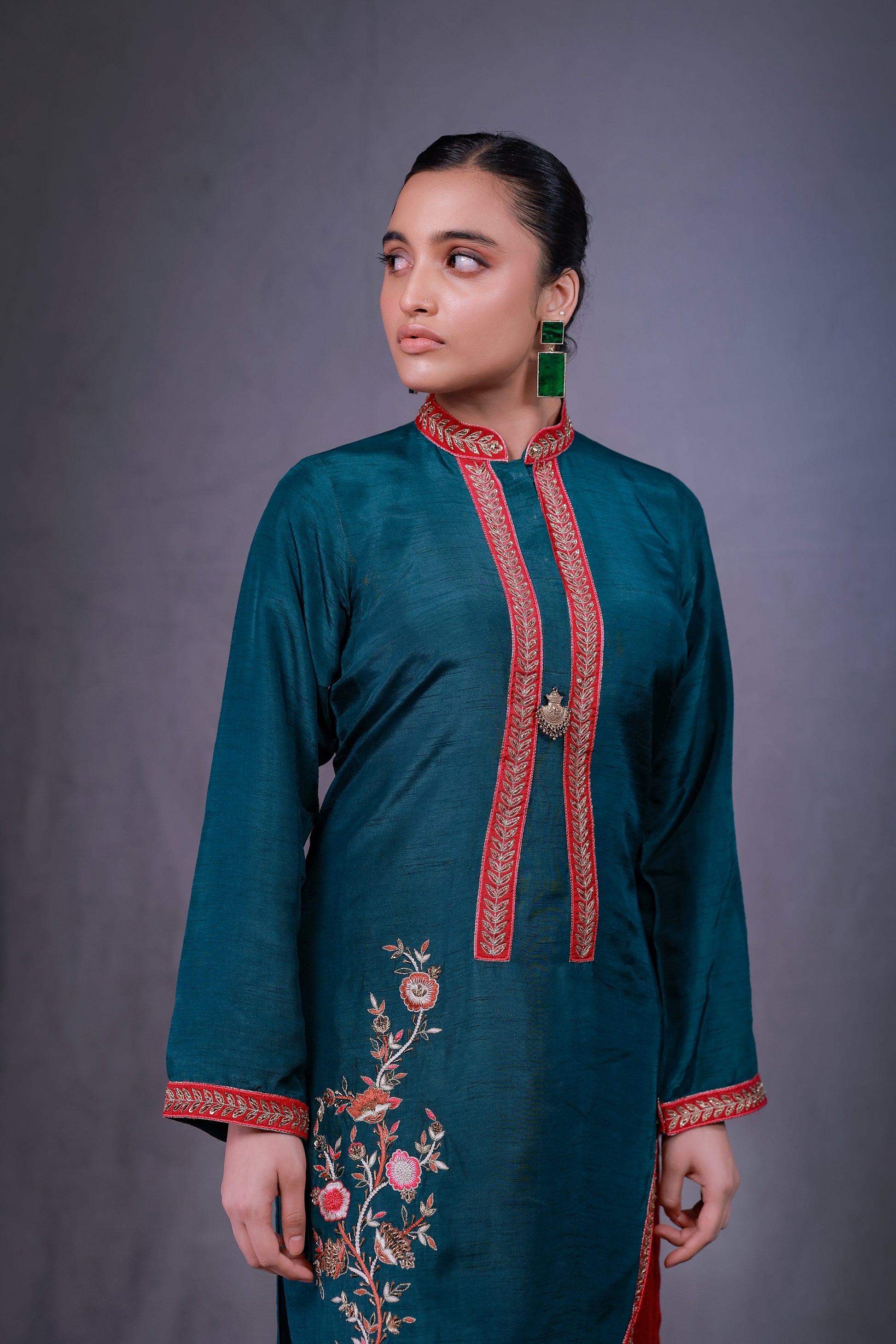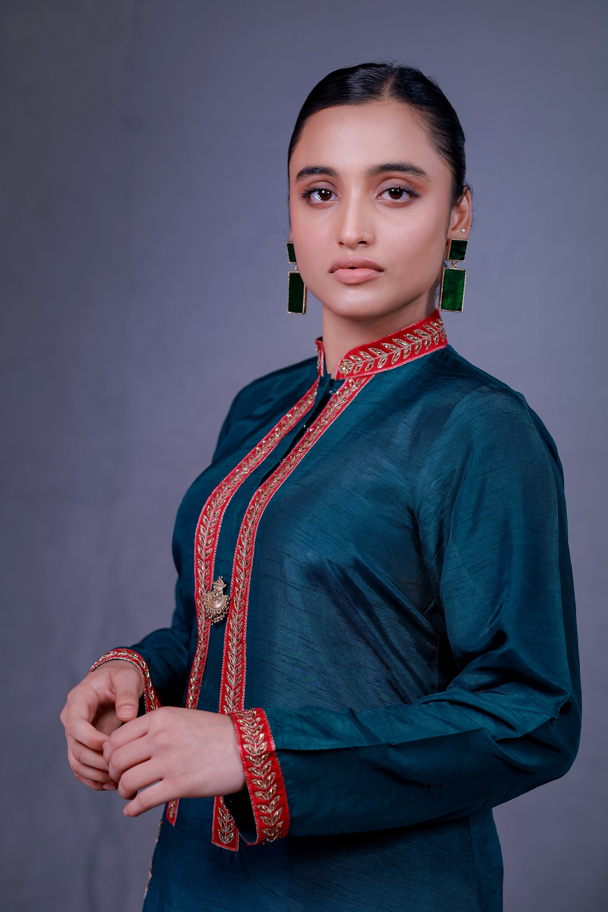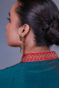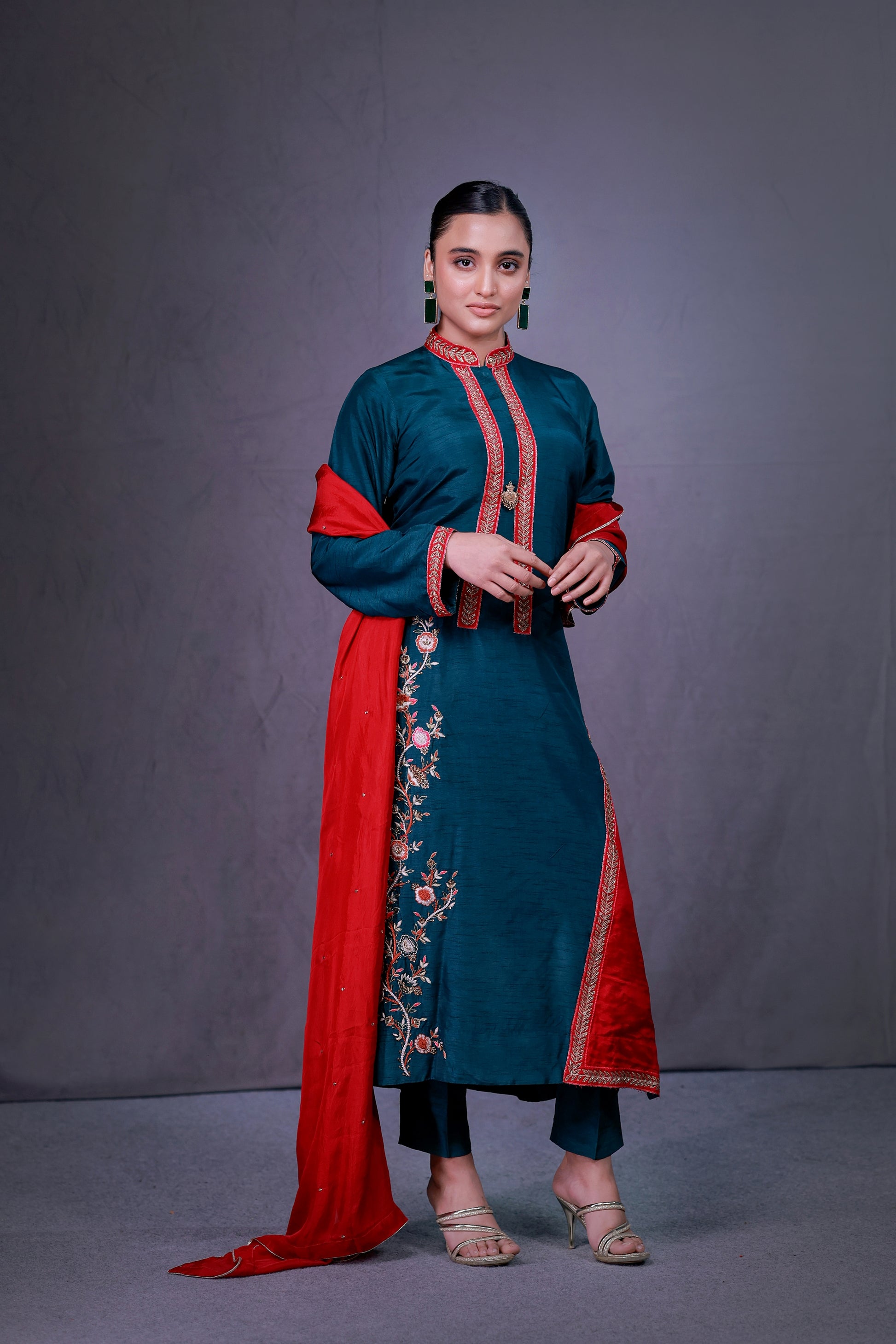 An emerald green, full-length shirt in pure raw silk, paired with a matching shalwar. The shirt features intricate hand embroidery using sitara, resham, moti, and zari, finished with magenta applique work. A jewel accent on the neckline adds a subtle shine. Inspired by Romeo and Juliet. Dupatta sold separately.