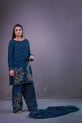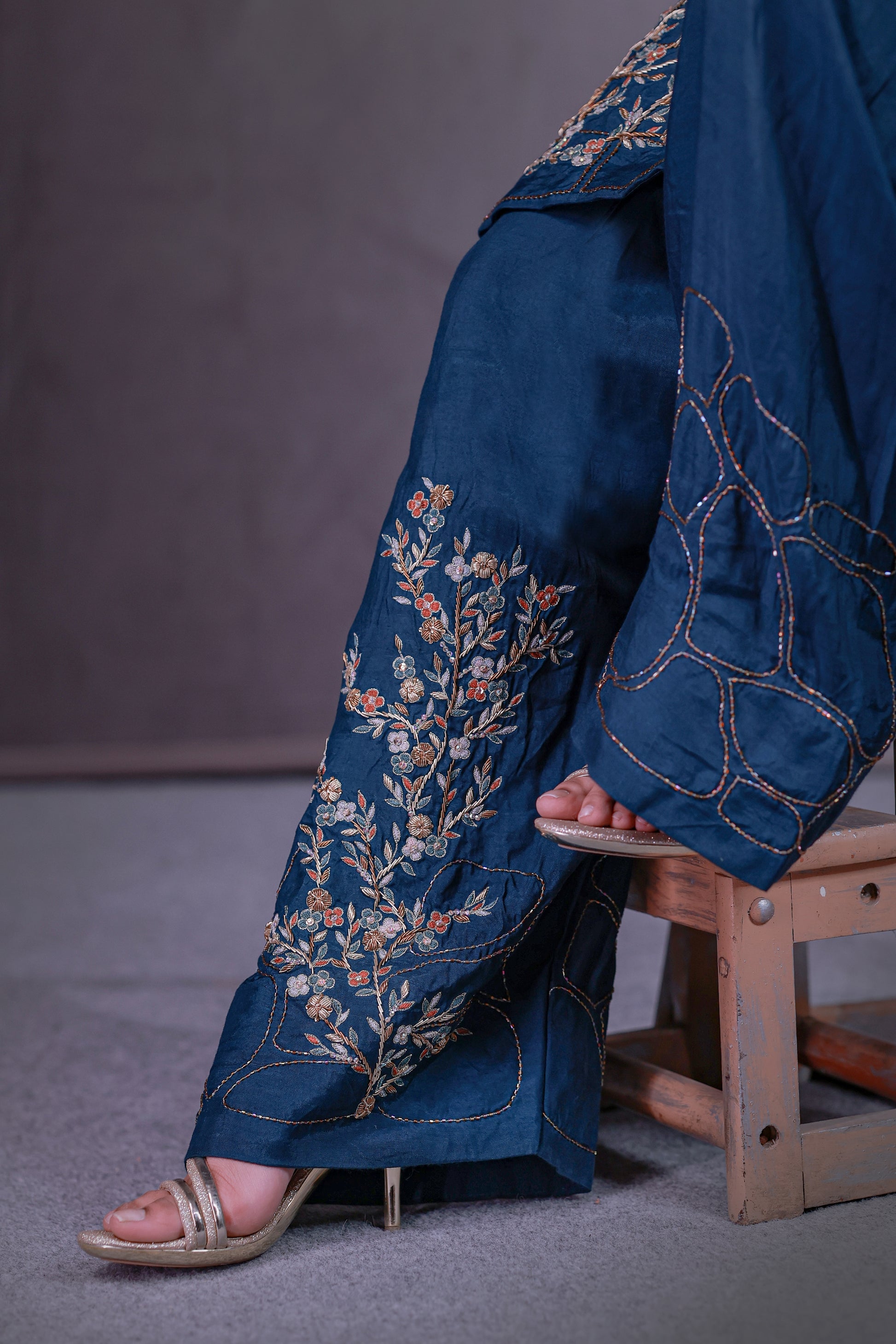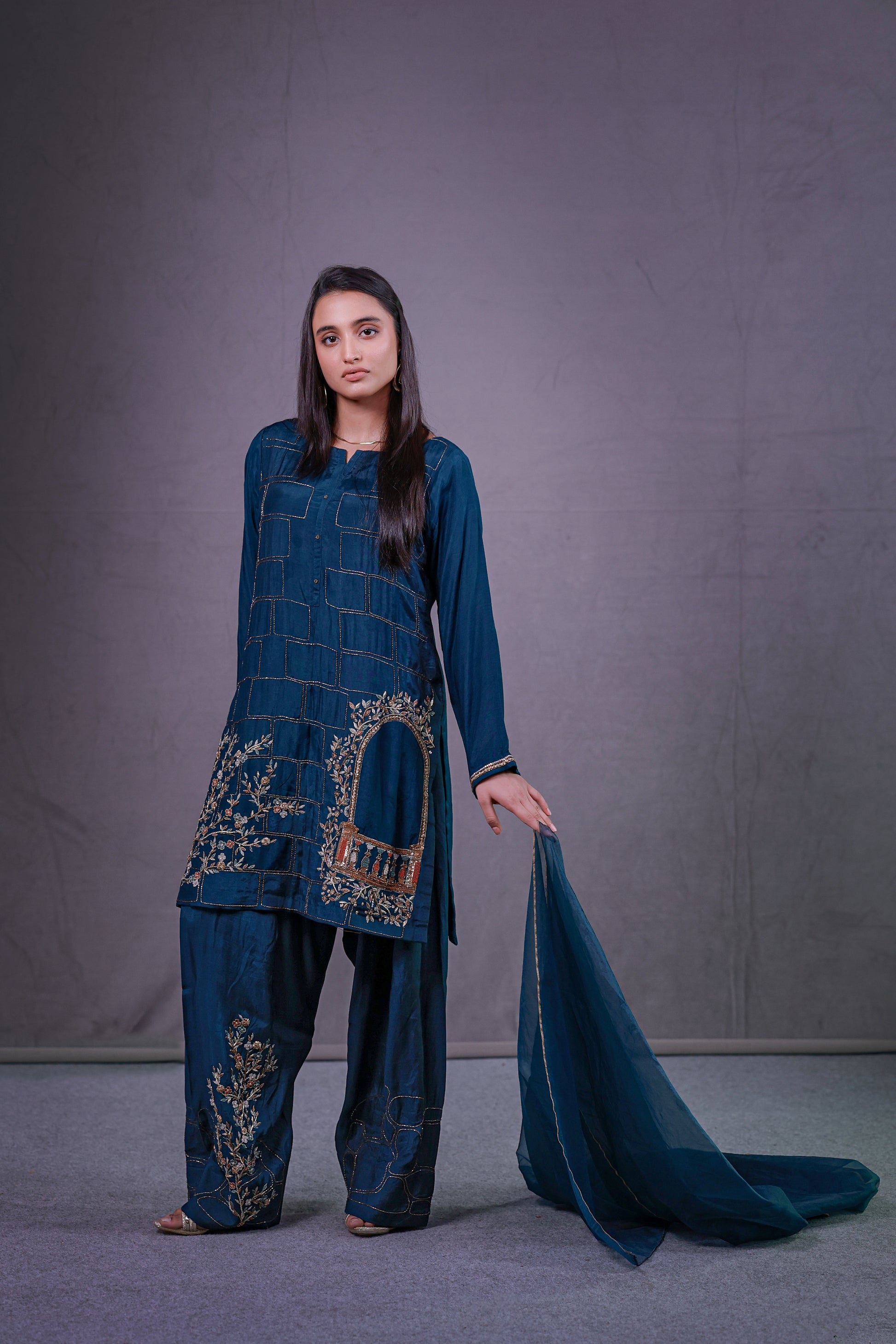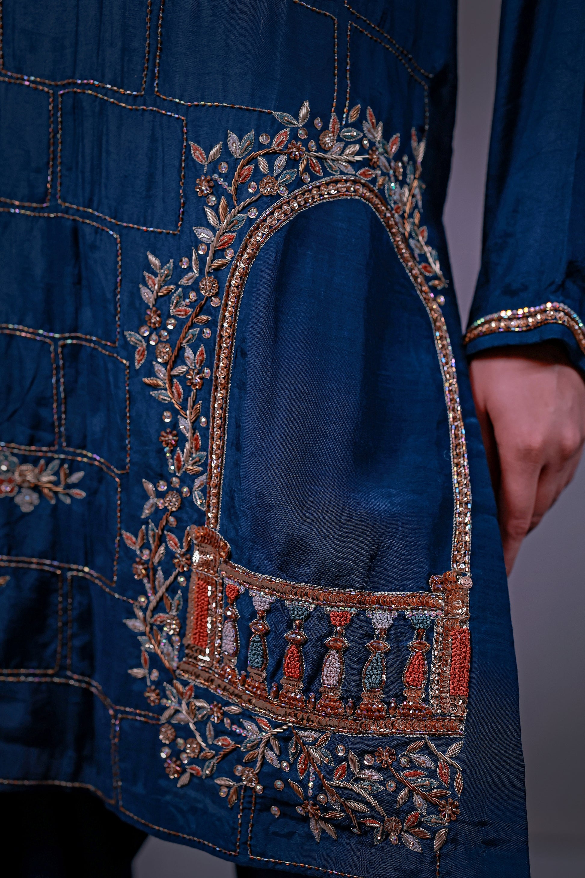 This mid-length raw silk shirt in deep ocean blue carries the tale of Romeo & Juliet. With fine adda work using dabka, salma, cut dana, tilla, resham, and sitara, the embroidery shows a jharoka symbolizing longing. Paired with a wide-leg embroidered shalwar. Dupatta sold separately.