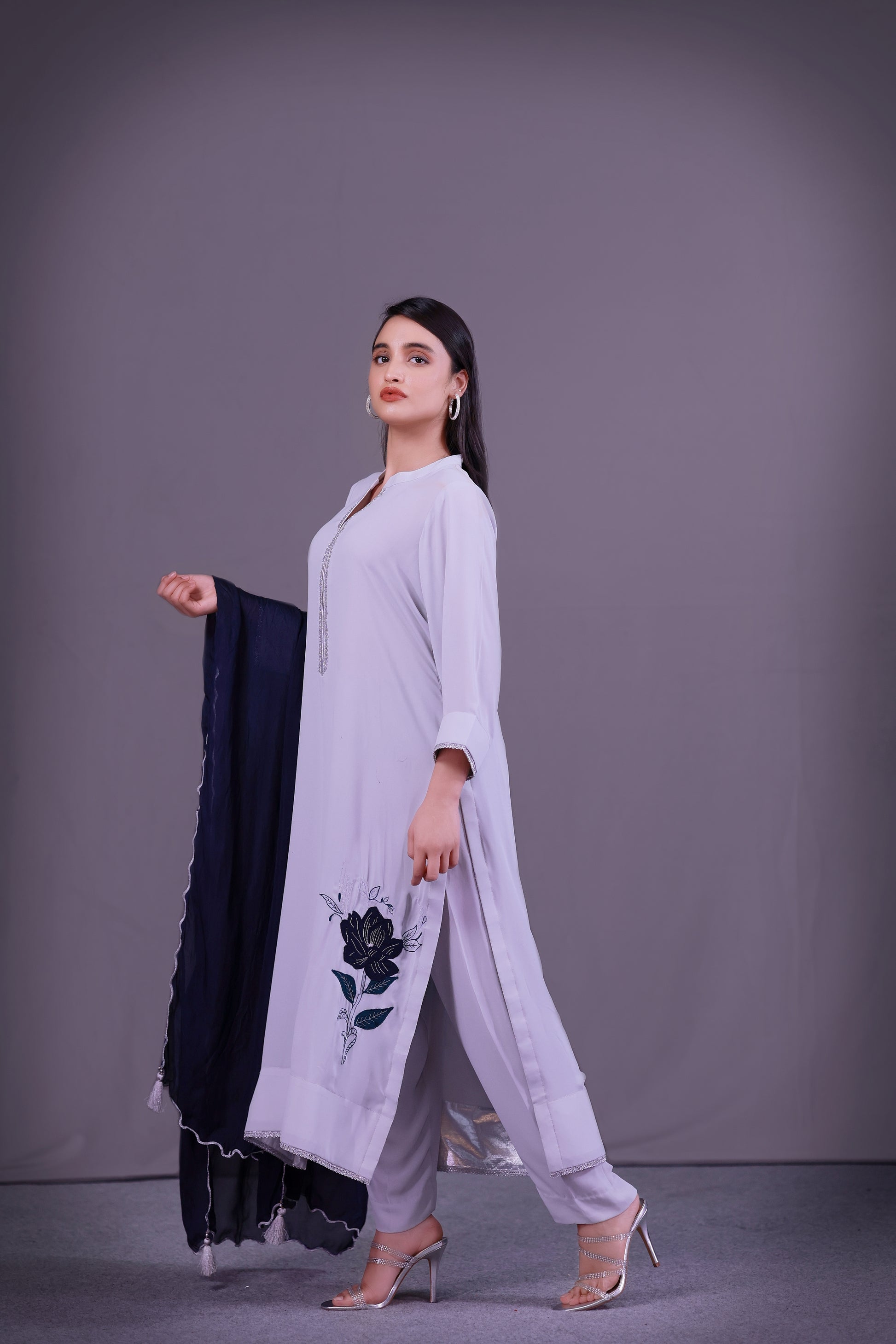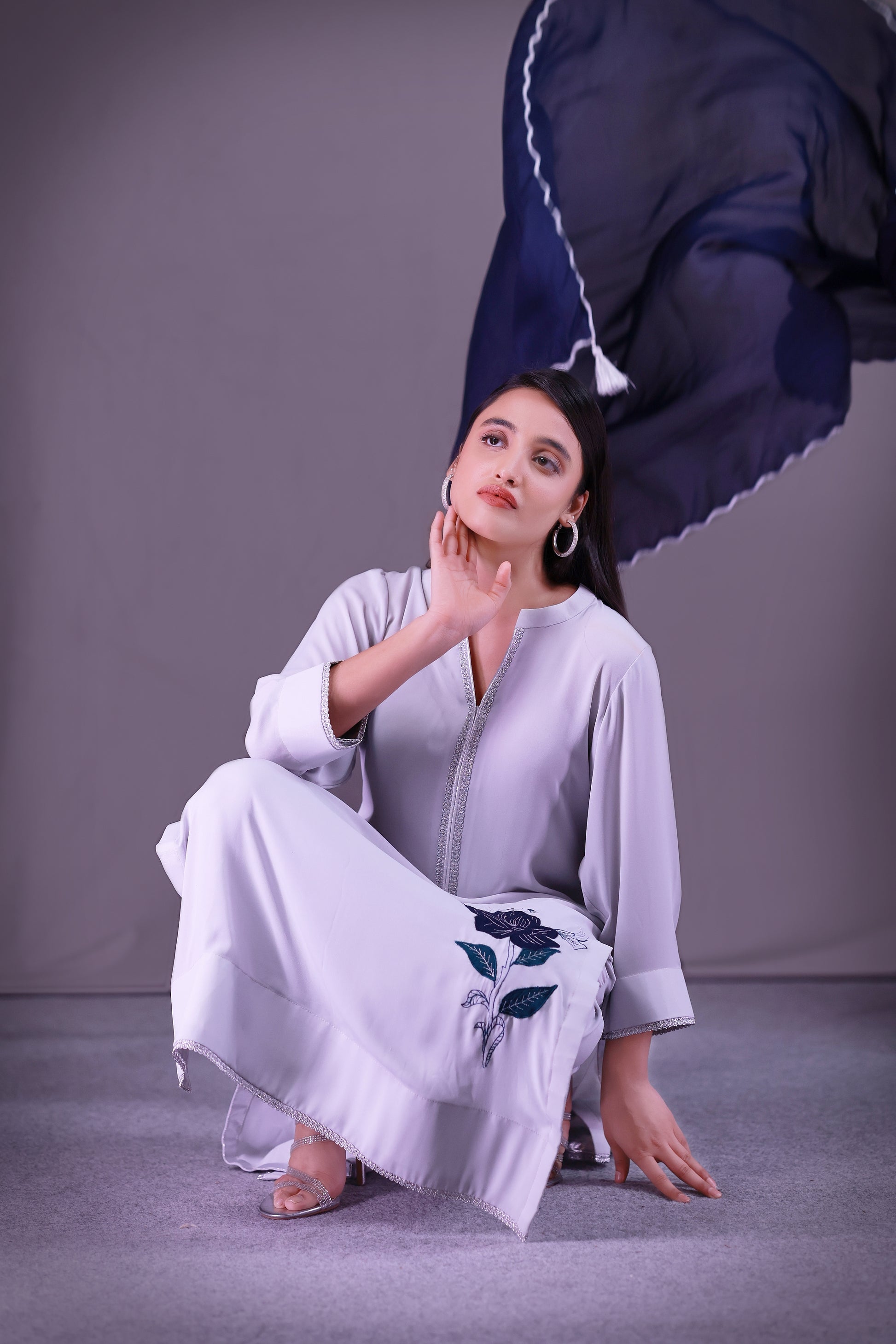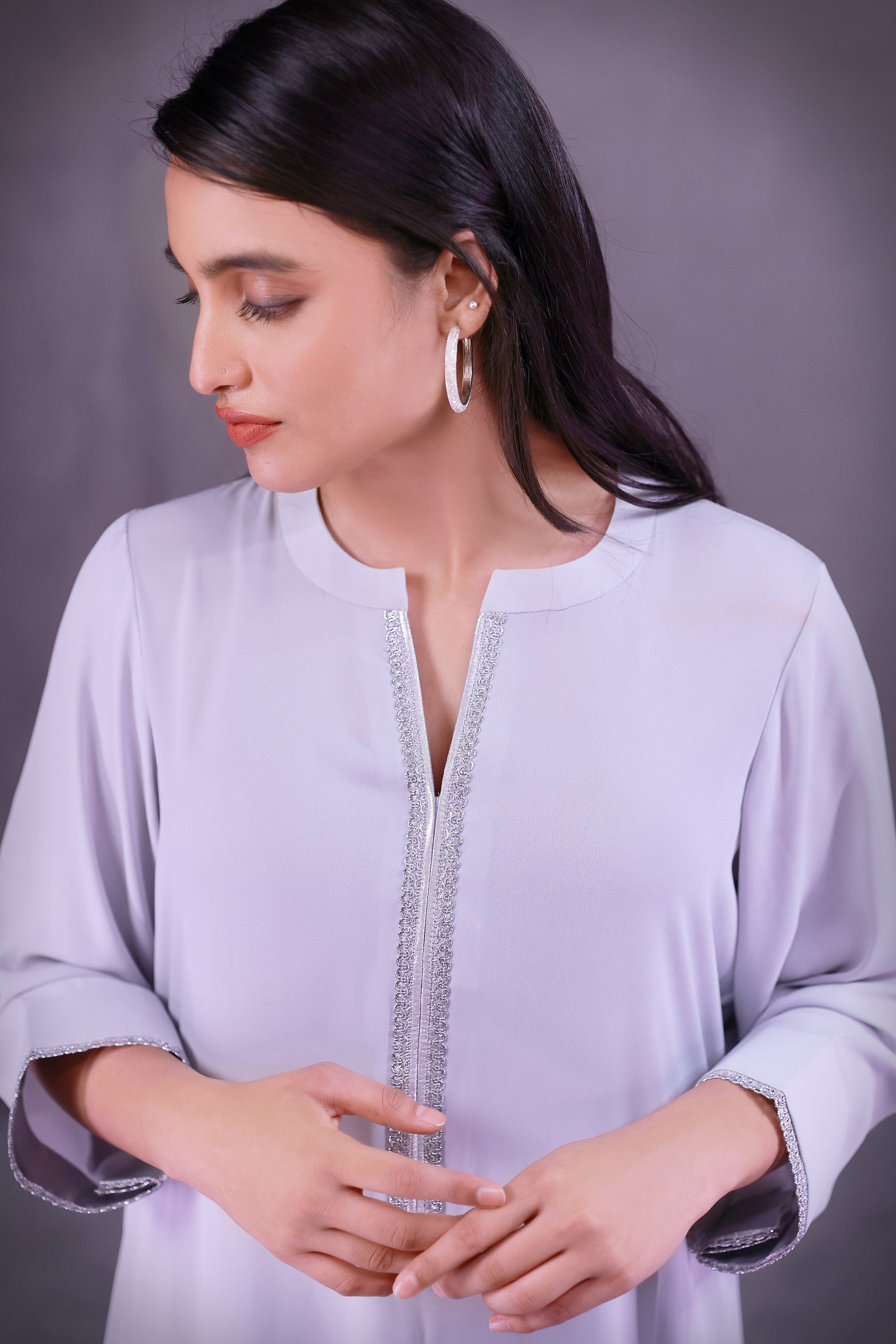An ash grey Pure Luxe Silk long shirt with a blue and green appliqué flower on the left, silver lace on neckline, sleeves and daman, with a relaxed collar and silver paltawa. Paired with straight pants for a clean elegant look.