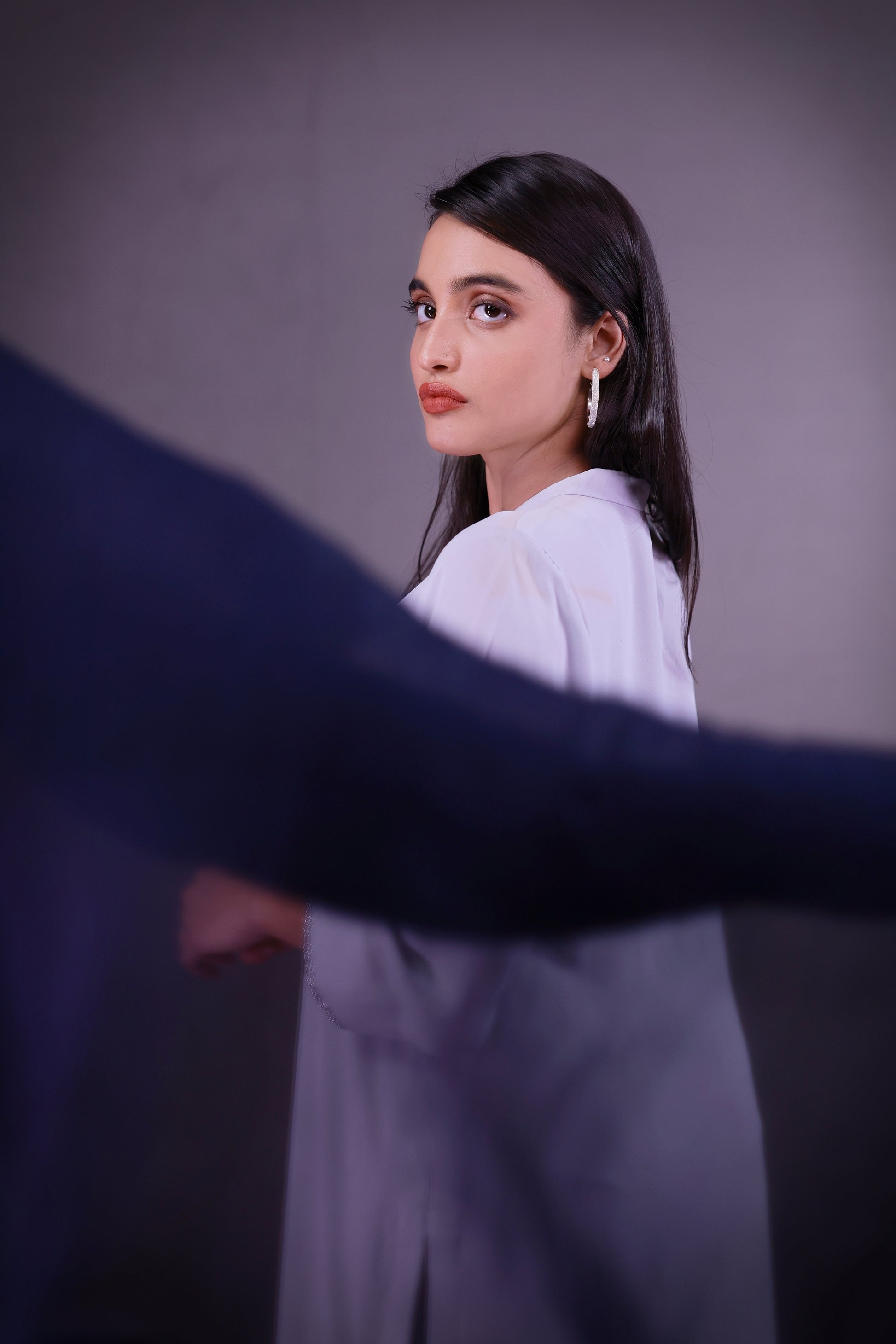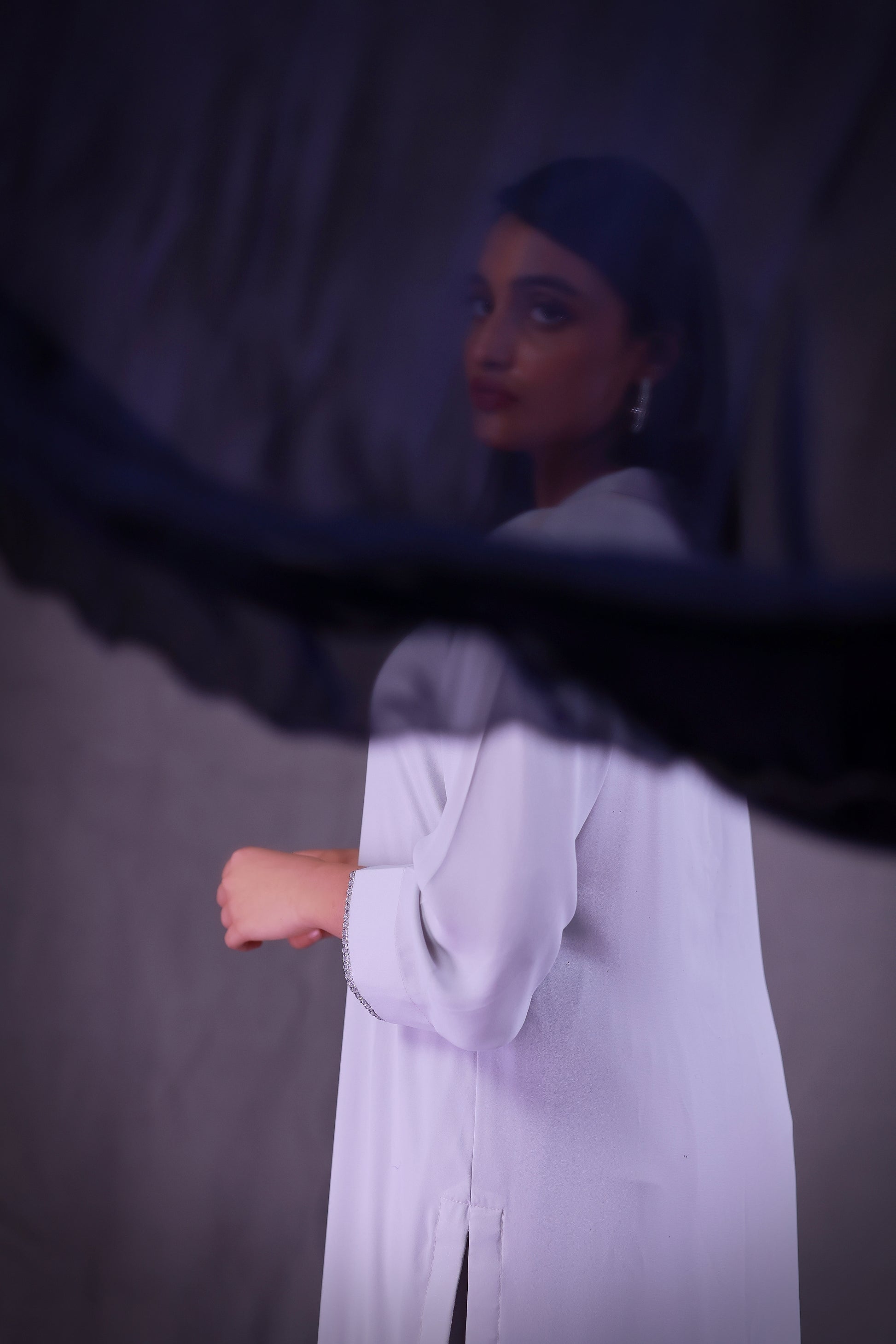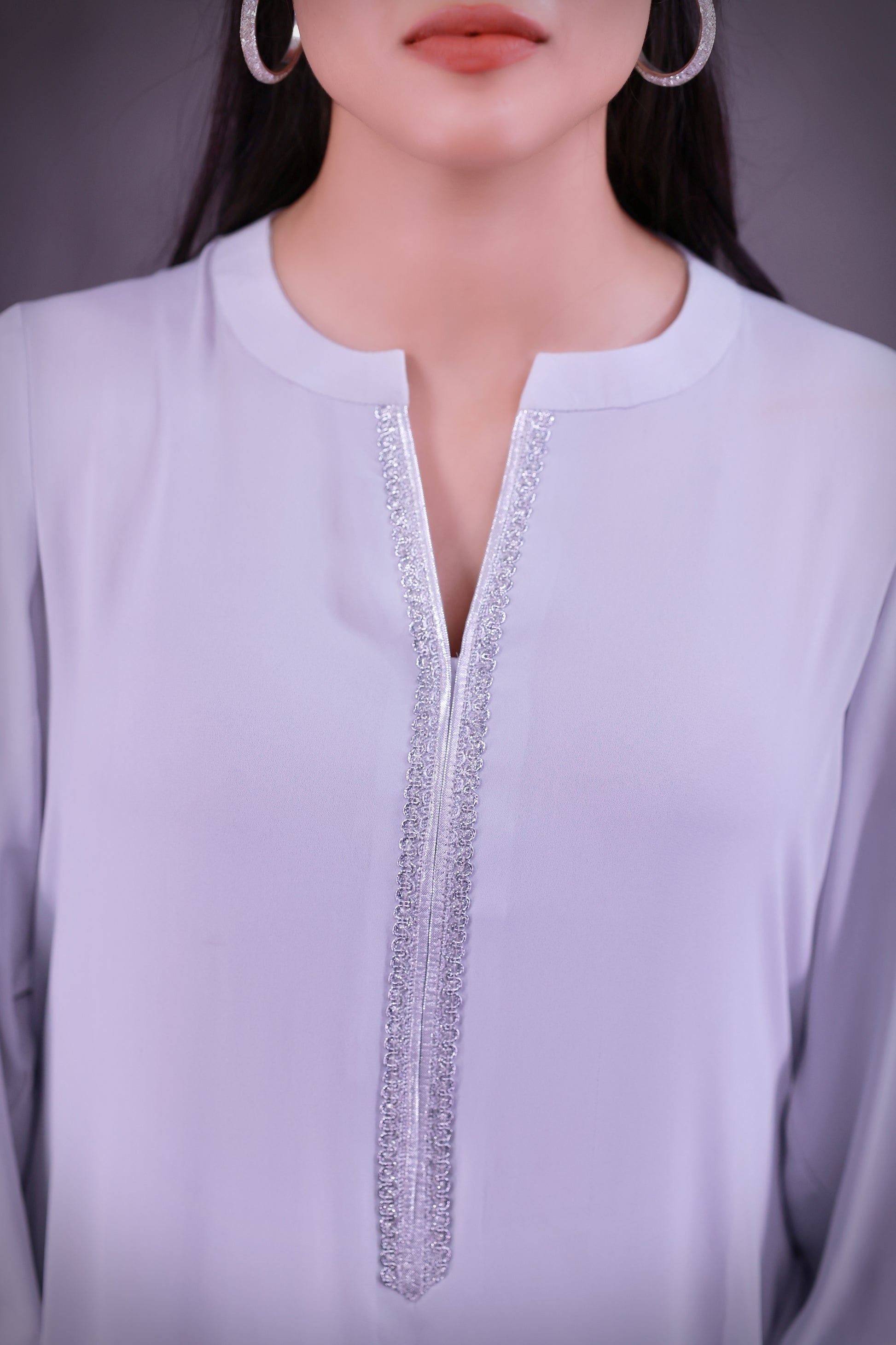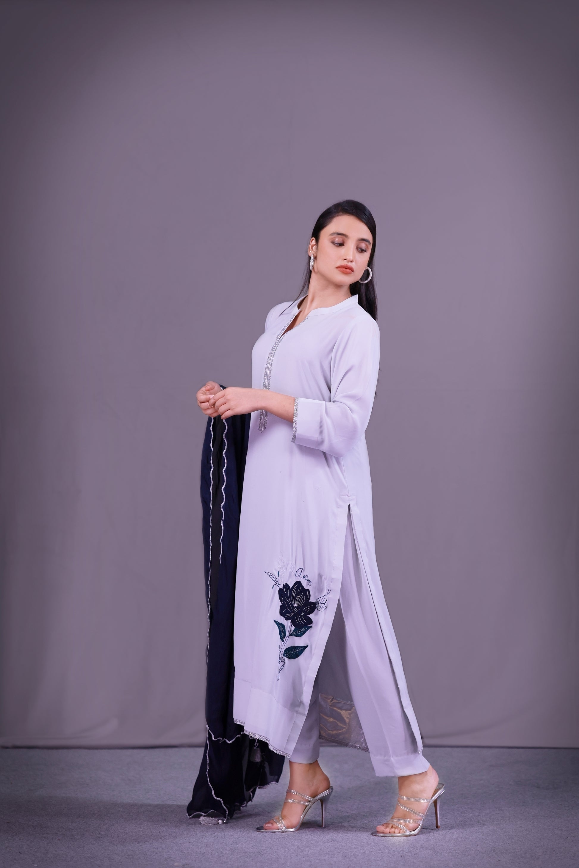 An ash grey Pure Luxe Silk long shirt with a blue and green appliqué flower on the left, silver lace on neckline, sleeves and daman, with a relaxed collar and silver paltawa. Paired with straight pants for a clean elegant look.
