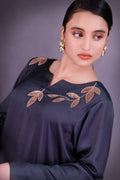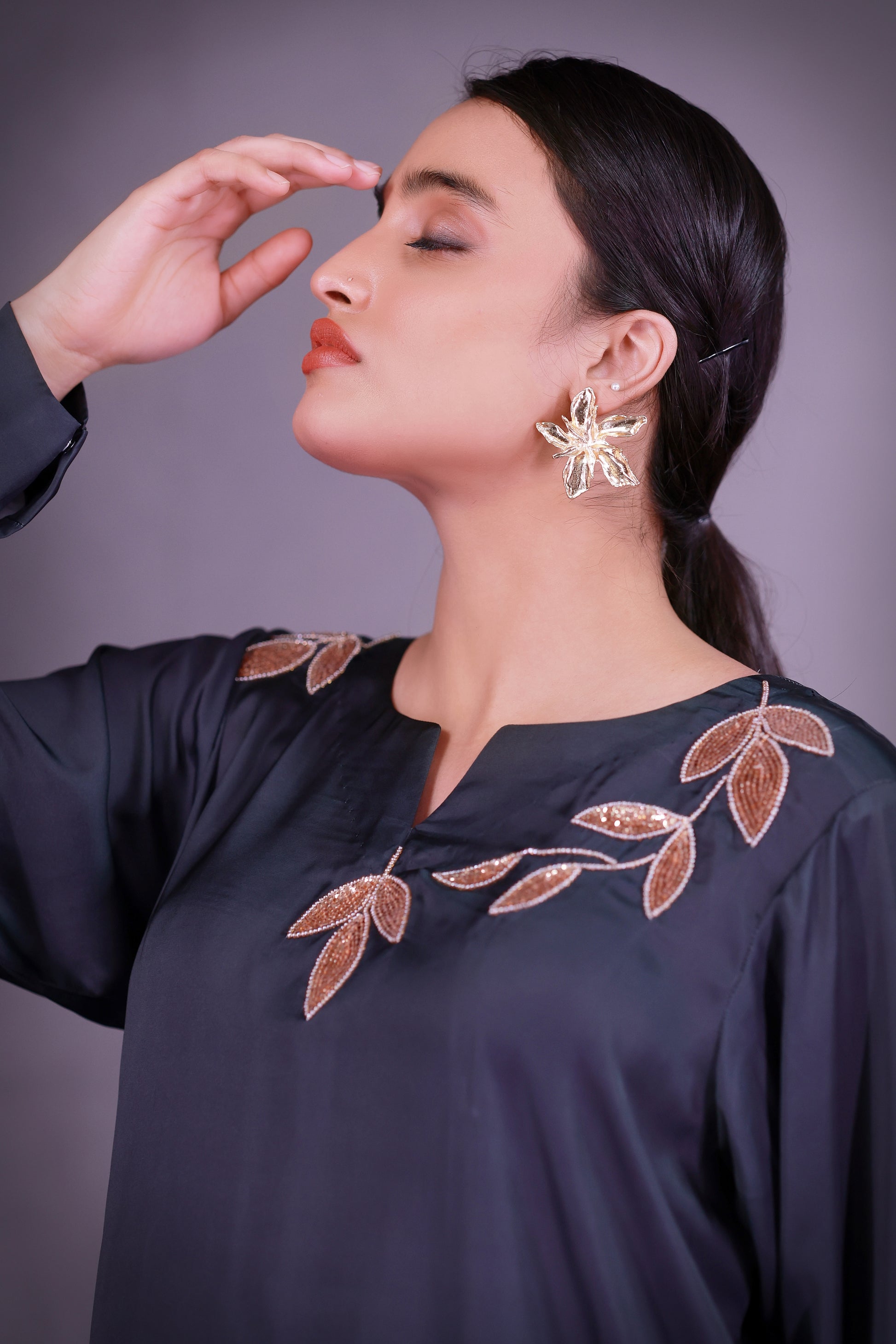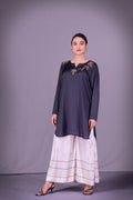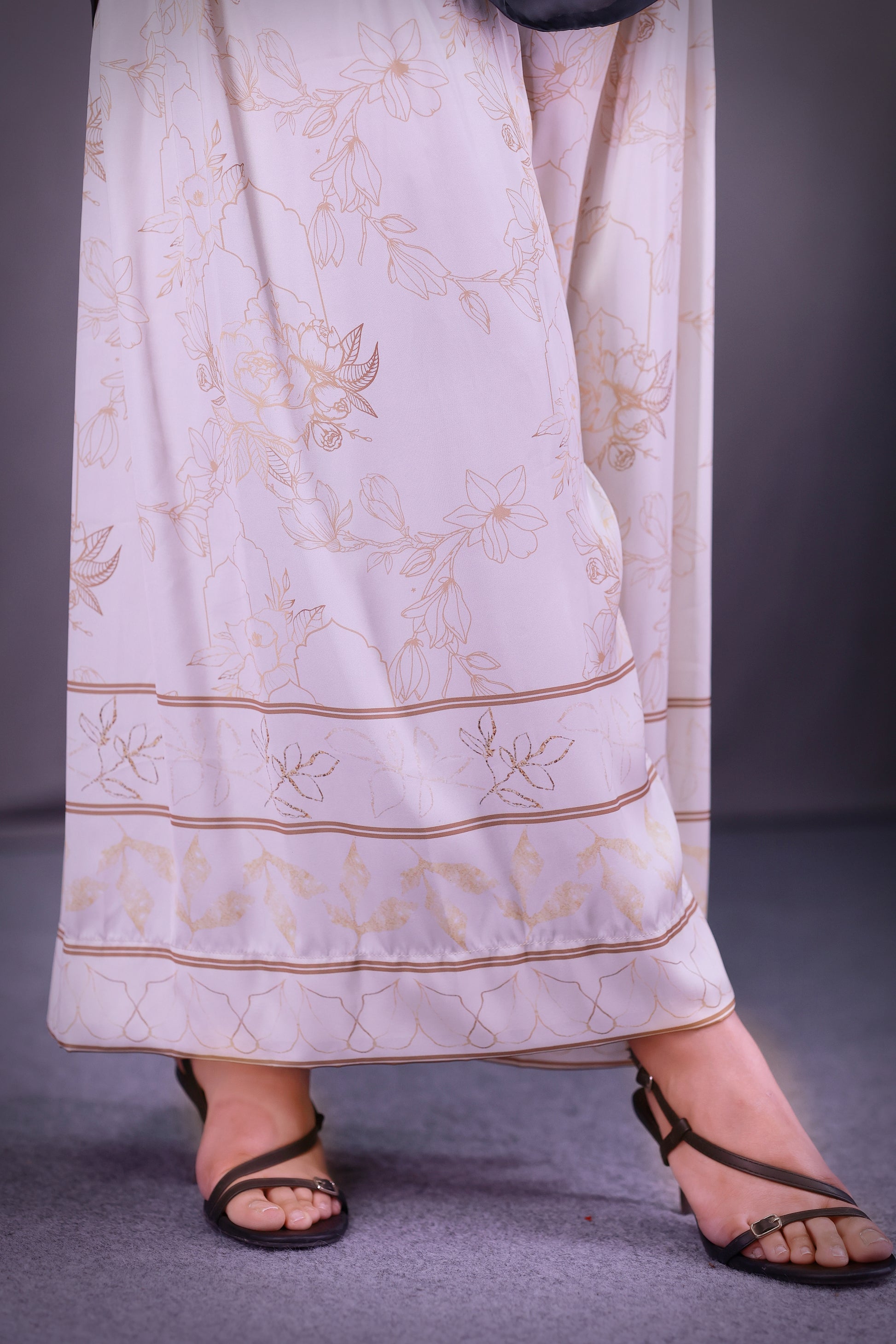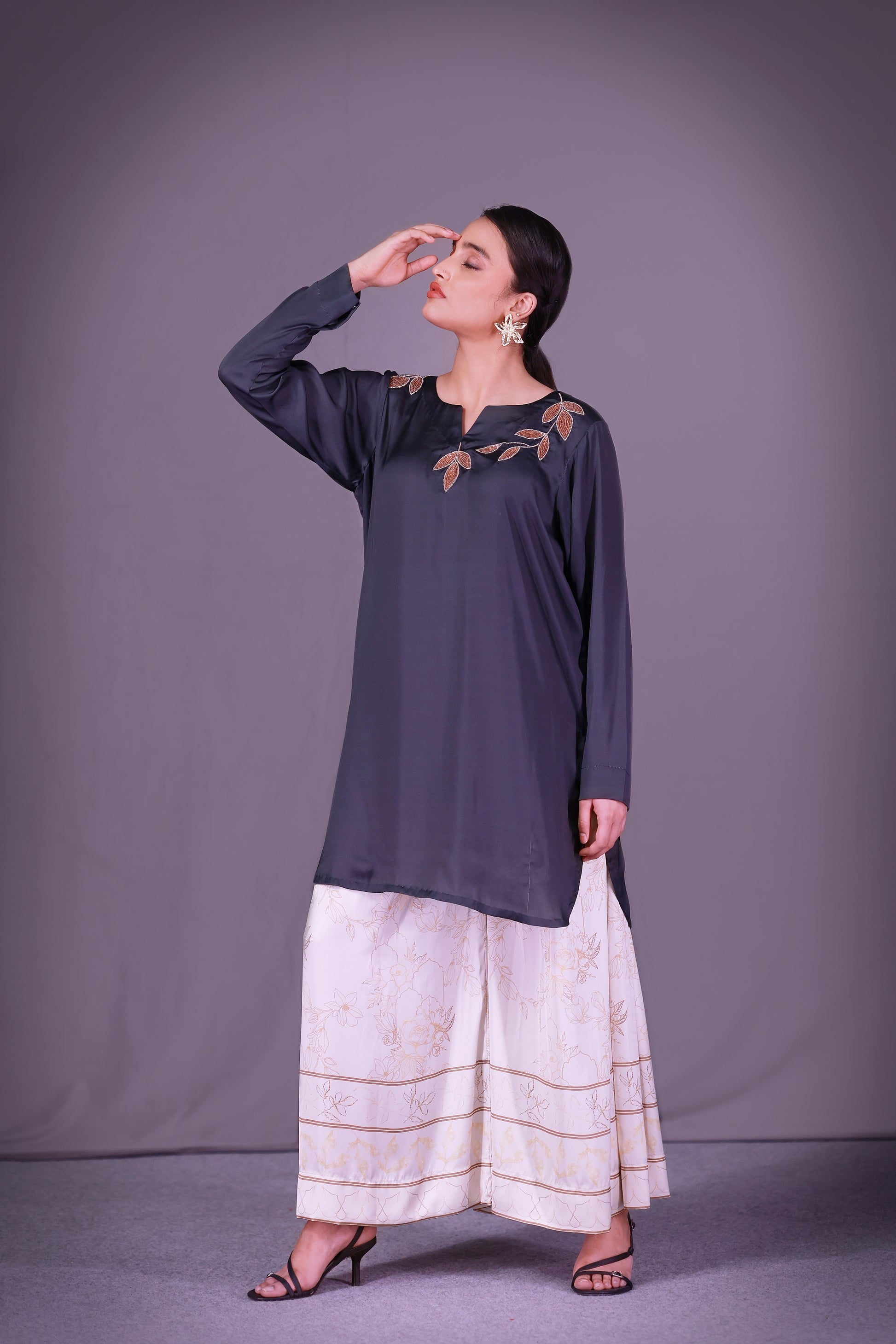 Charcoal green shirt with adda work paired with off white and gold vine motif palazzo