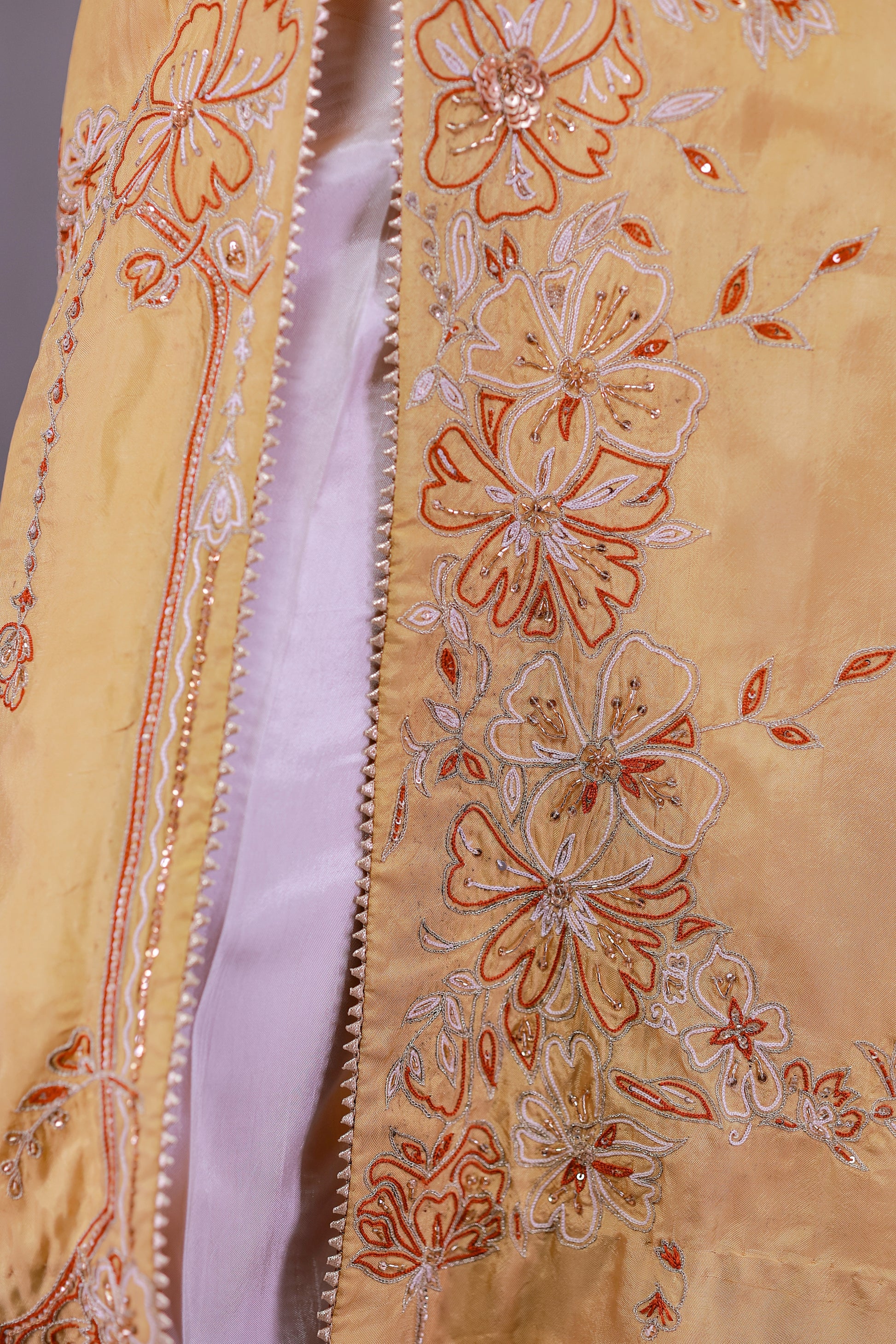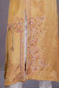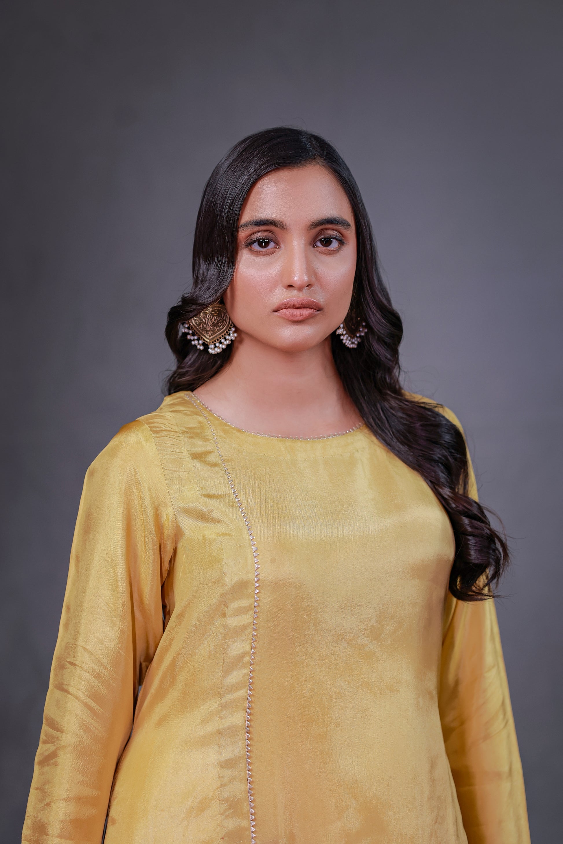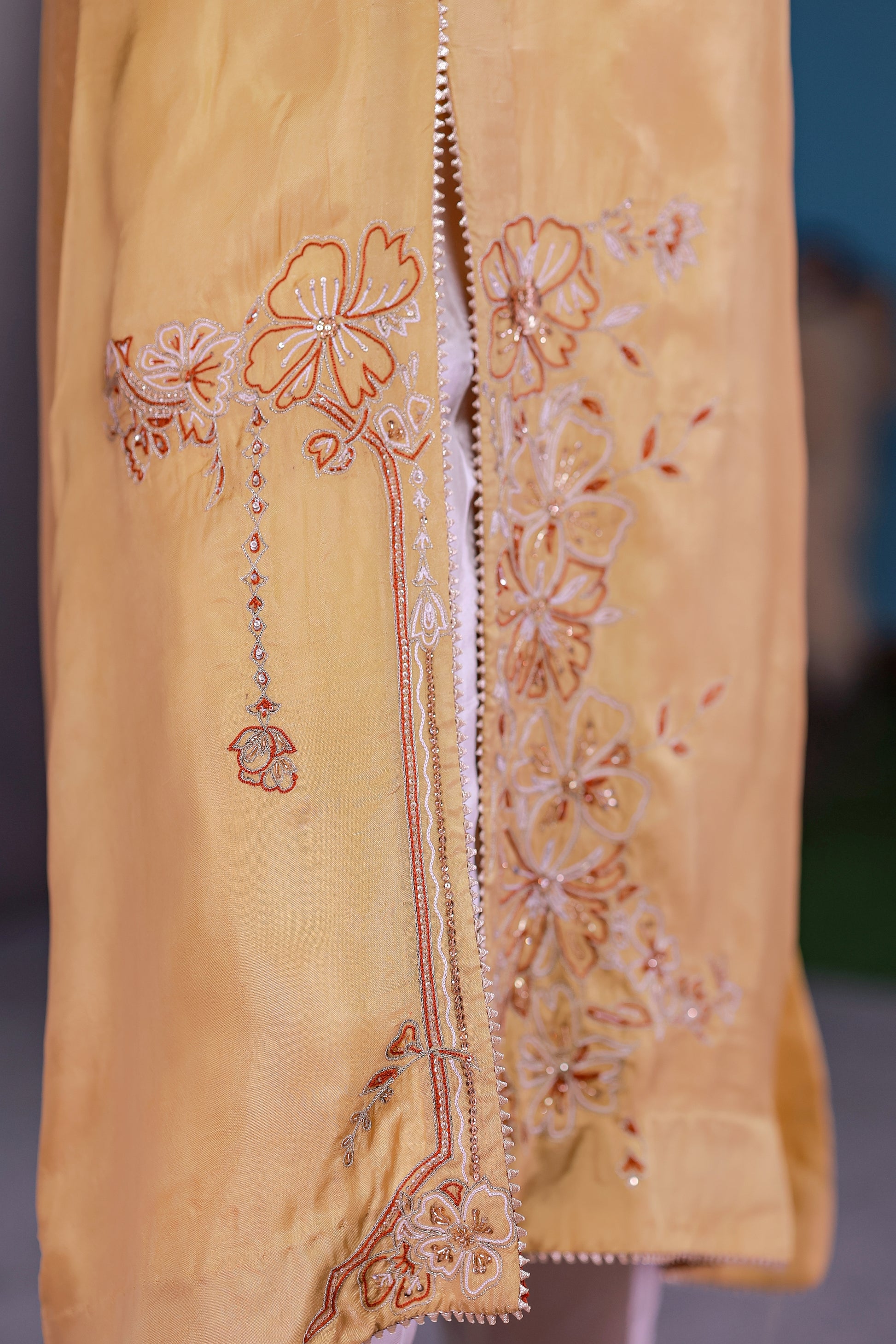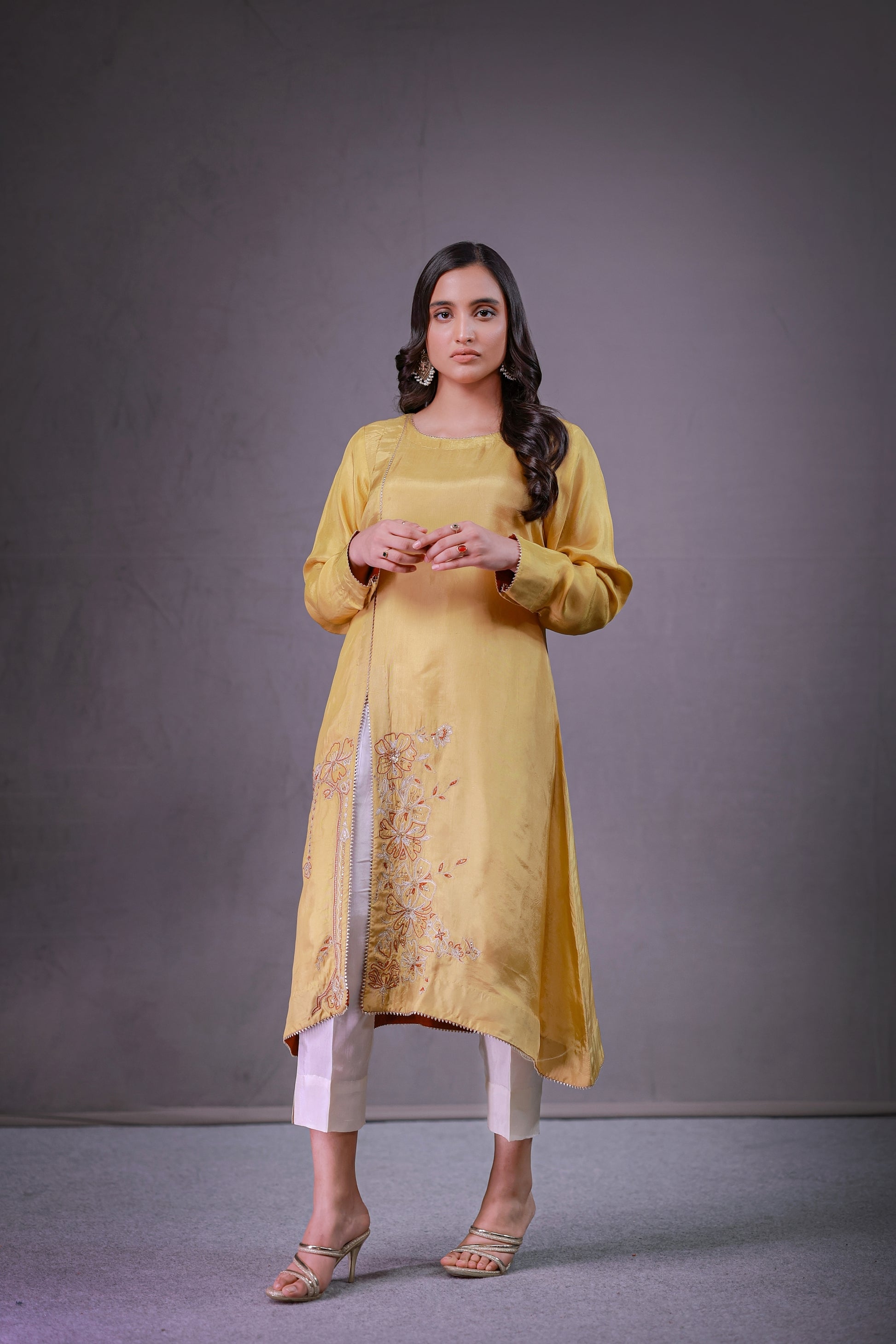 A full-length mustard raw silk shirt inspired by Heer Ranjha. Features side embroidery of tree branches, finished with a rust paltawa on the slit and sleeves. Paired with pearl white straight pants.