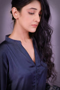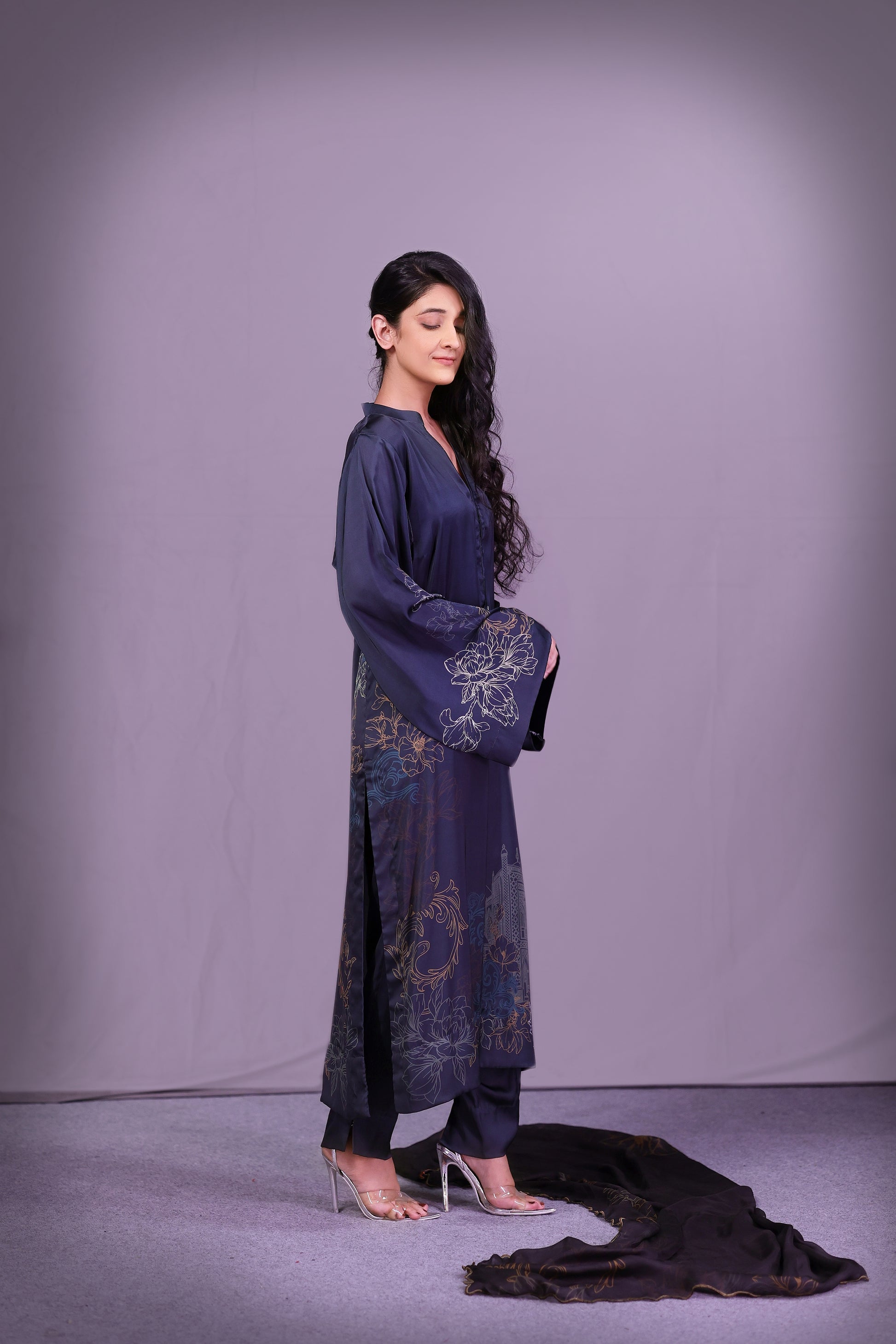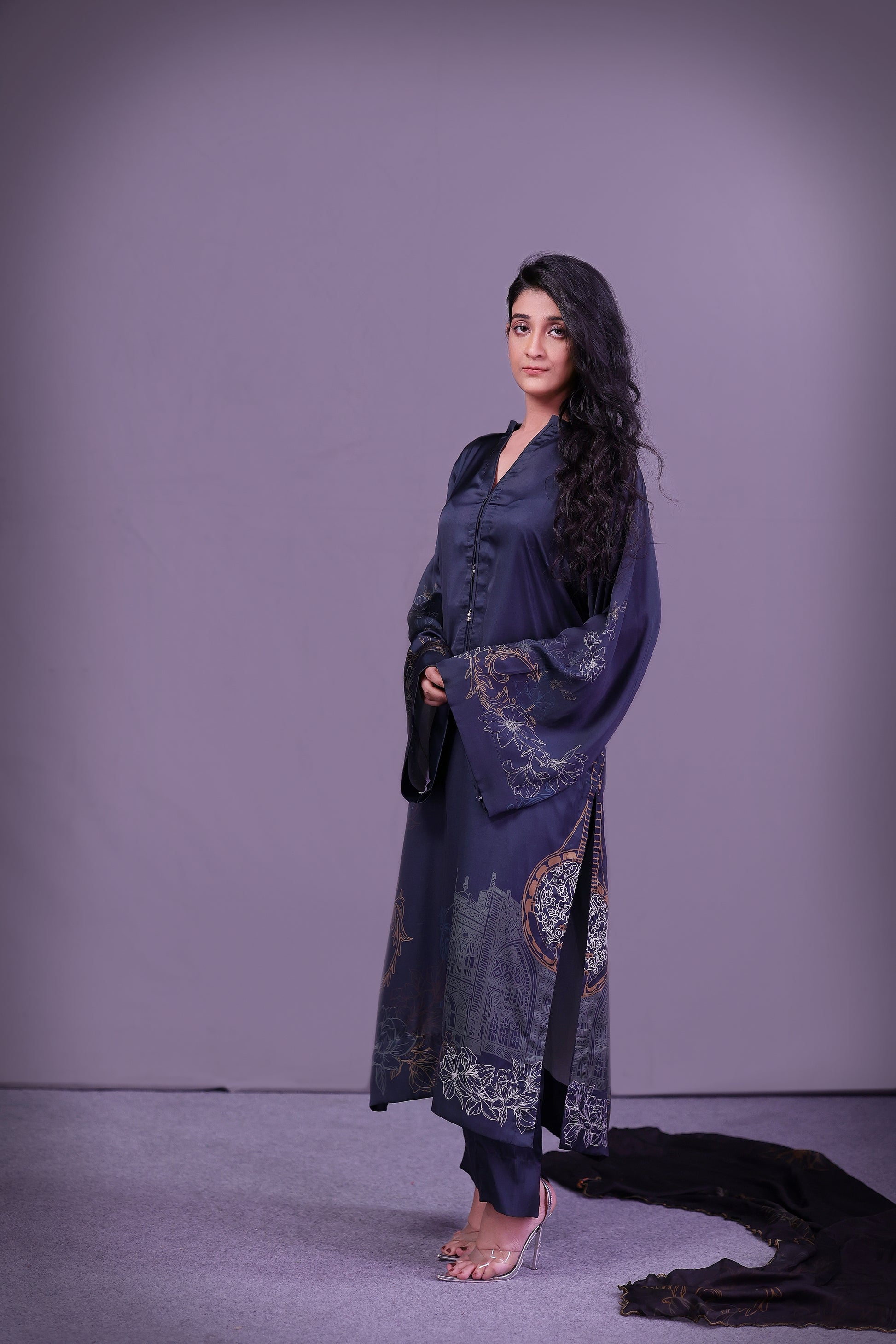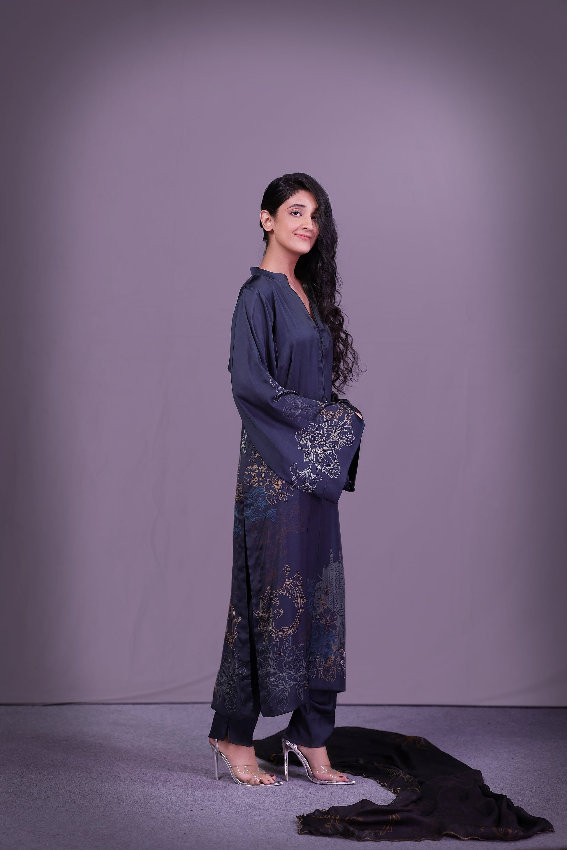 This forest teal long shirt in Pure Fine Lawn is inspired by Tansen’s melodies featuring Rabab motifs divided along the slit and delicate florals on sleeve edges. Paired with a printed medium silk dupatta and straight pant it blends heritage with ease.