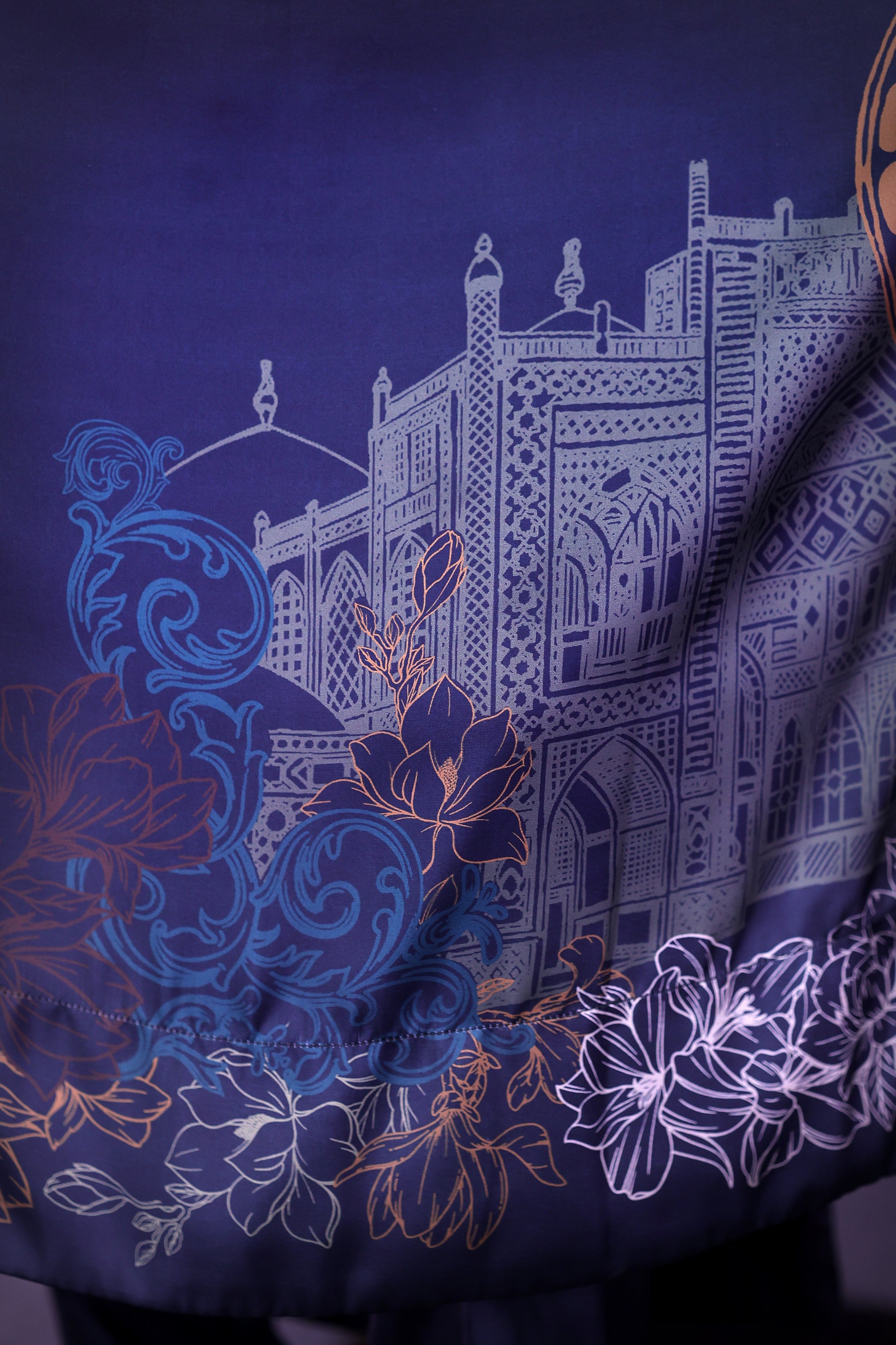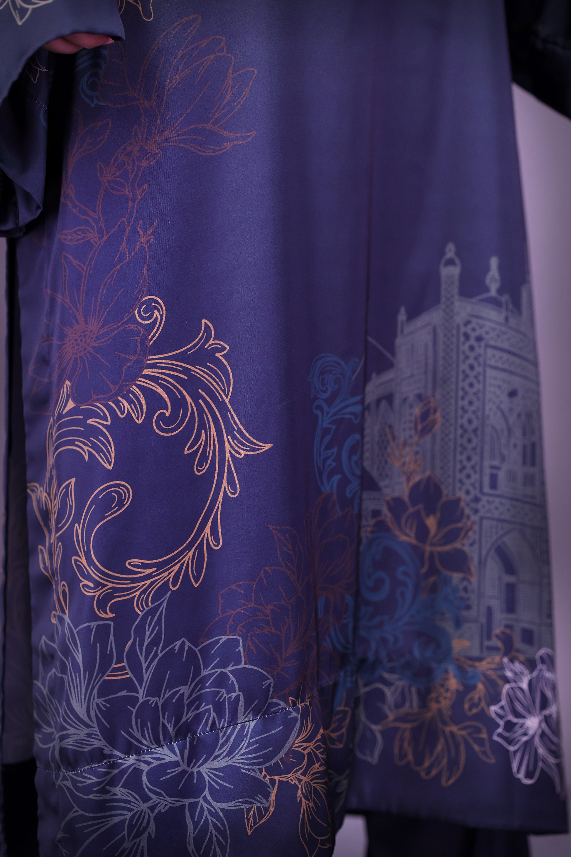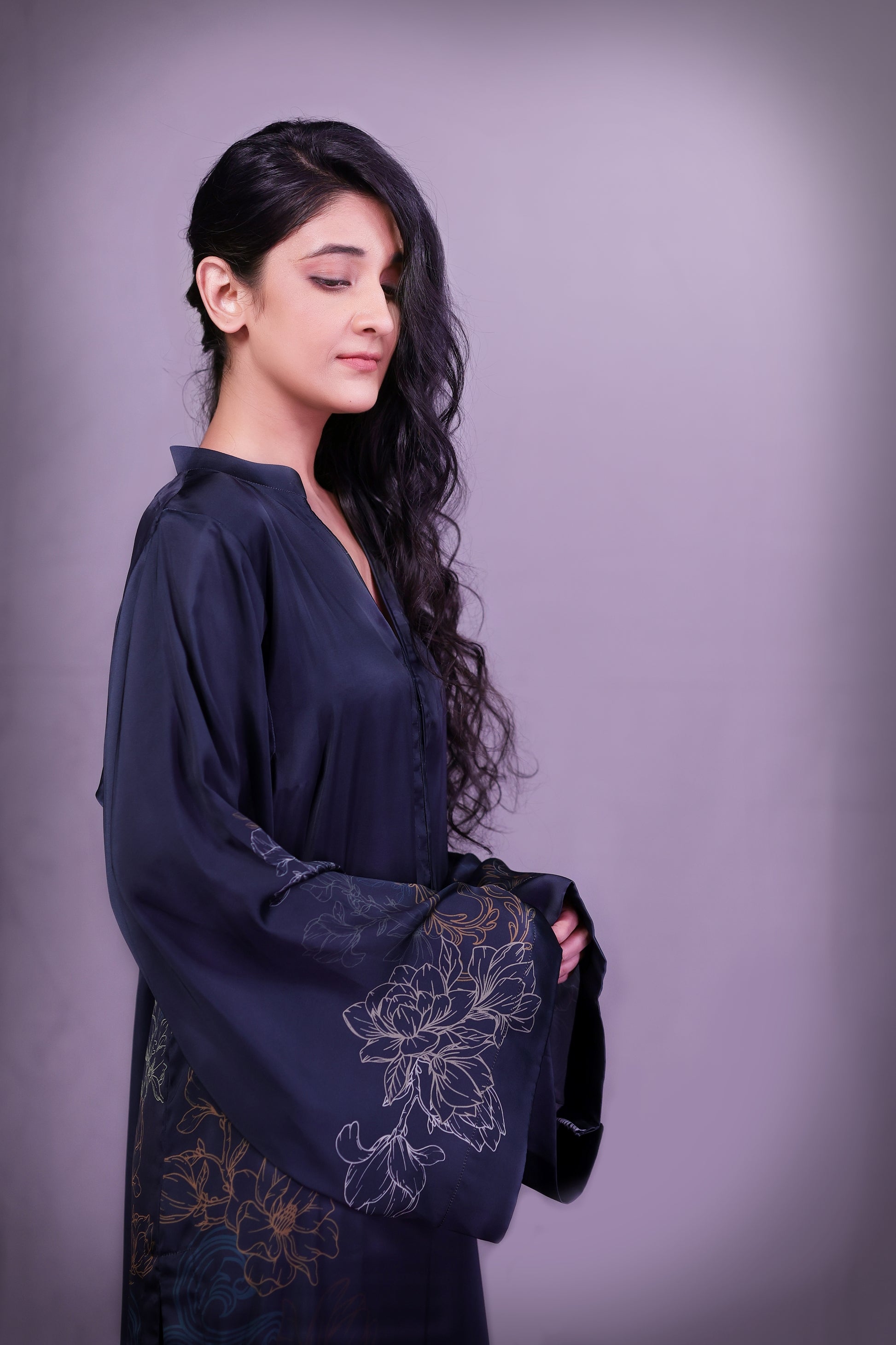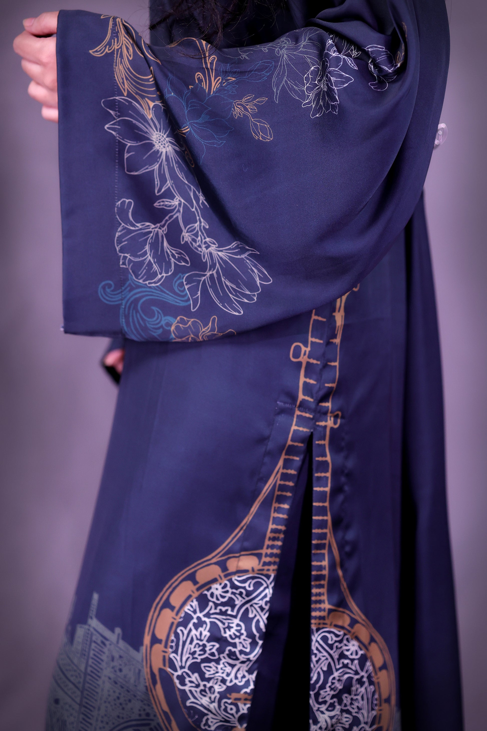 This forest teal long shirt in Pure Fine Lawn is inspired by Tansen’s melodies featuring Rabab motifs divided along the slit and delicate florals on sleeve edges. Paired with a printed medium silk dupatta and straight pant it blends heritage with ease.