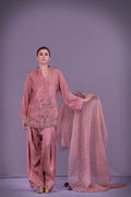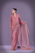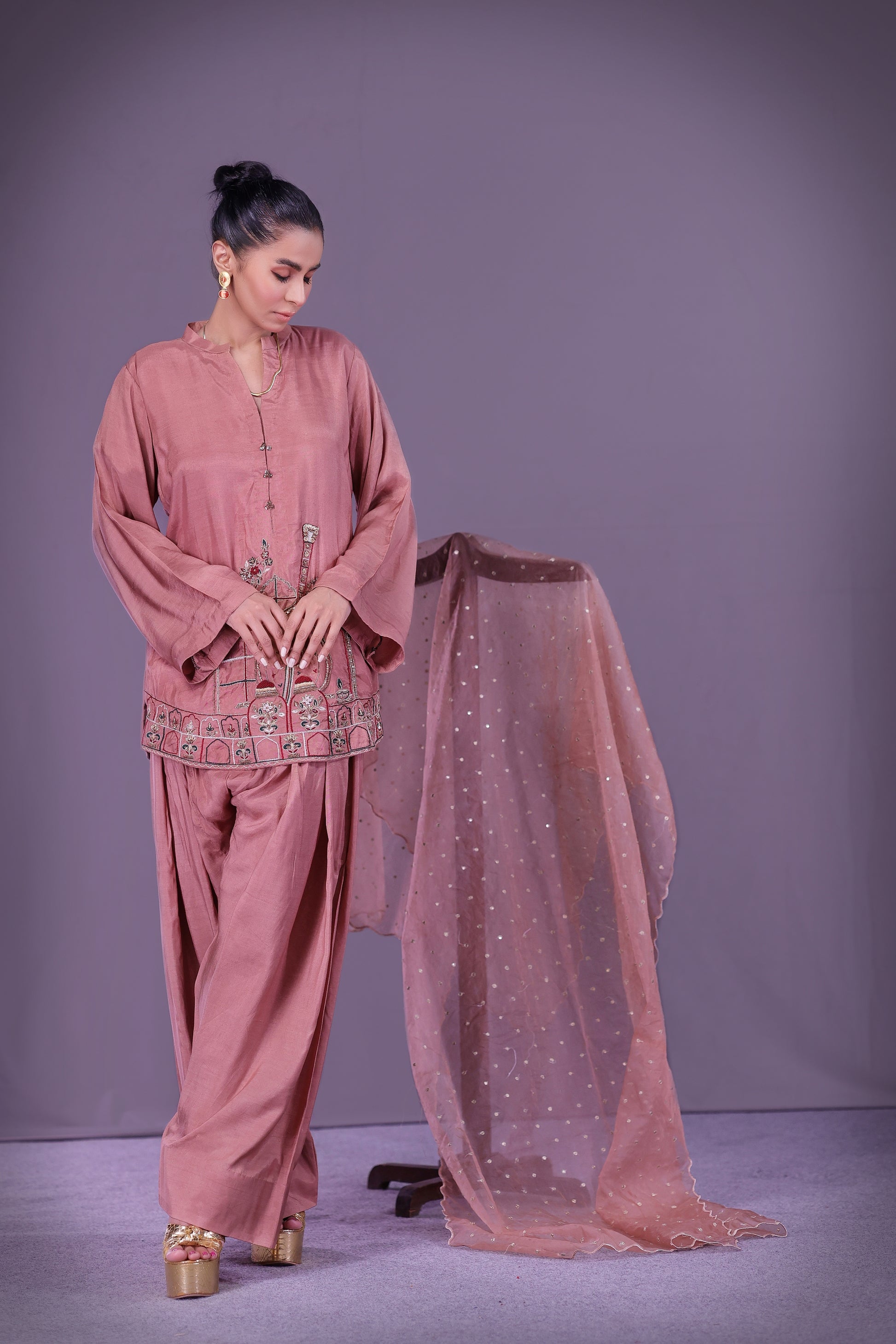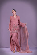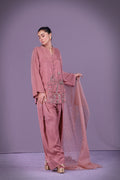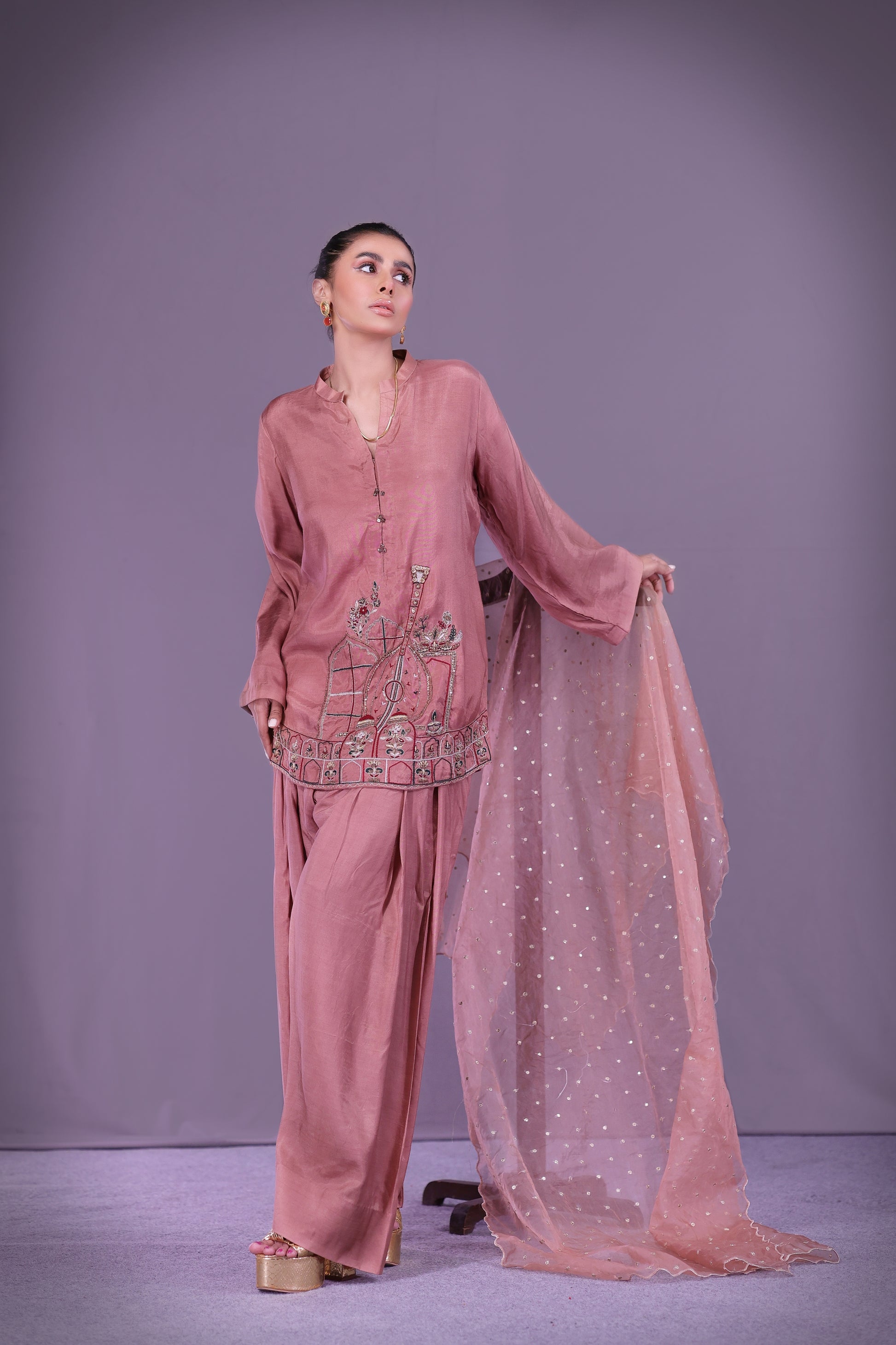 Muted rose short shirt embroidered with a central rabab, celebrating Tansen’s music. Detailed with resham, sitara, salma, dabka, moti, cut dana, tilla, and naqshi. Paired with traditional shalwar. Dupatta sold separately.