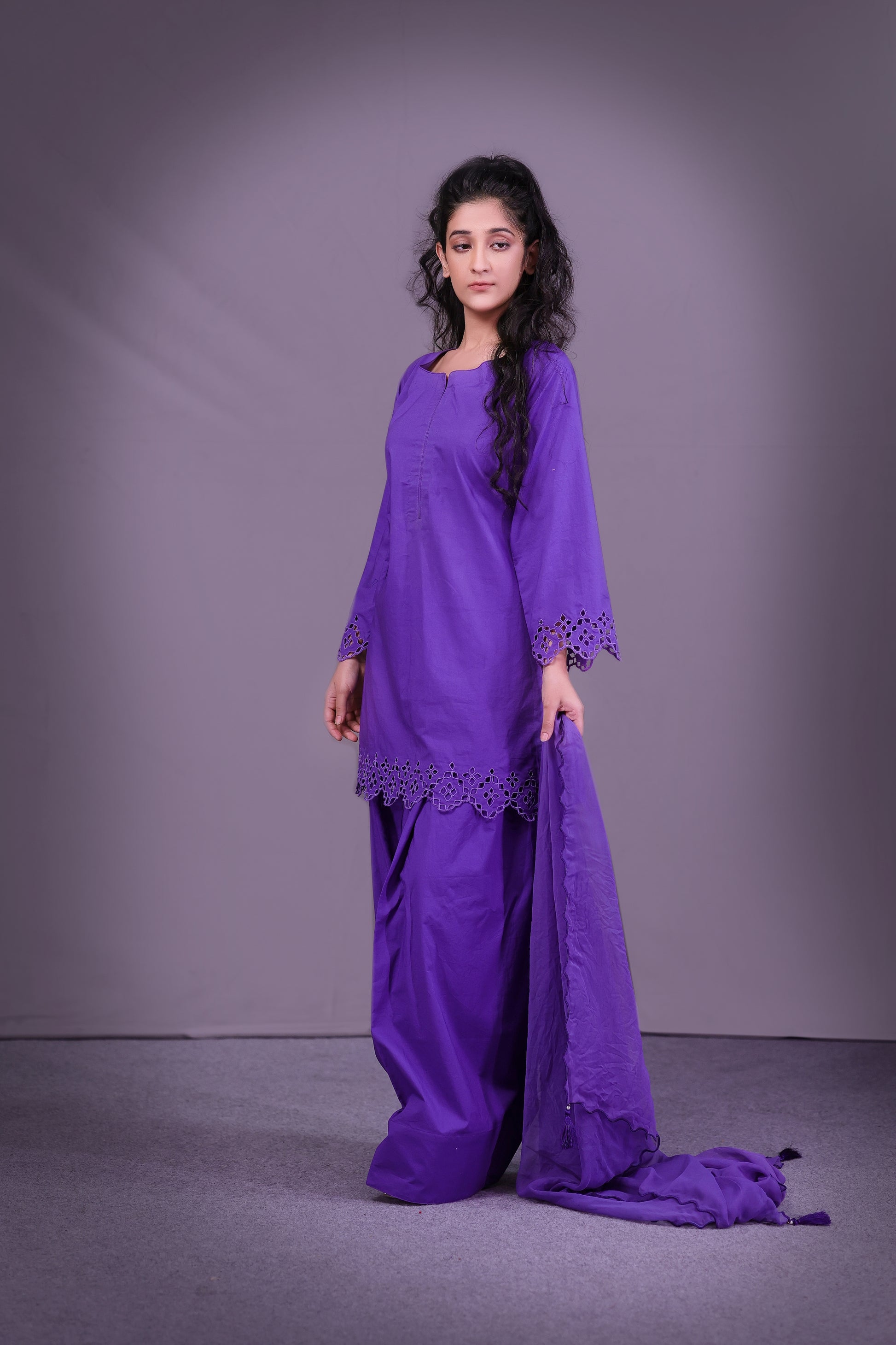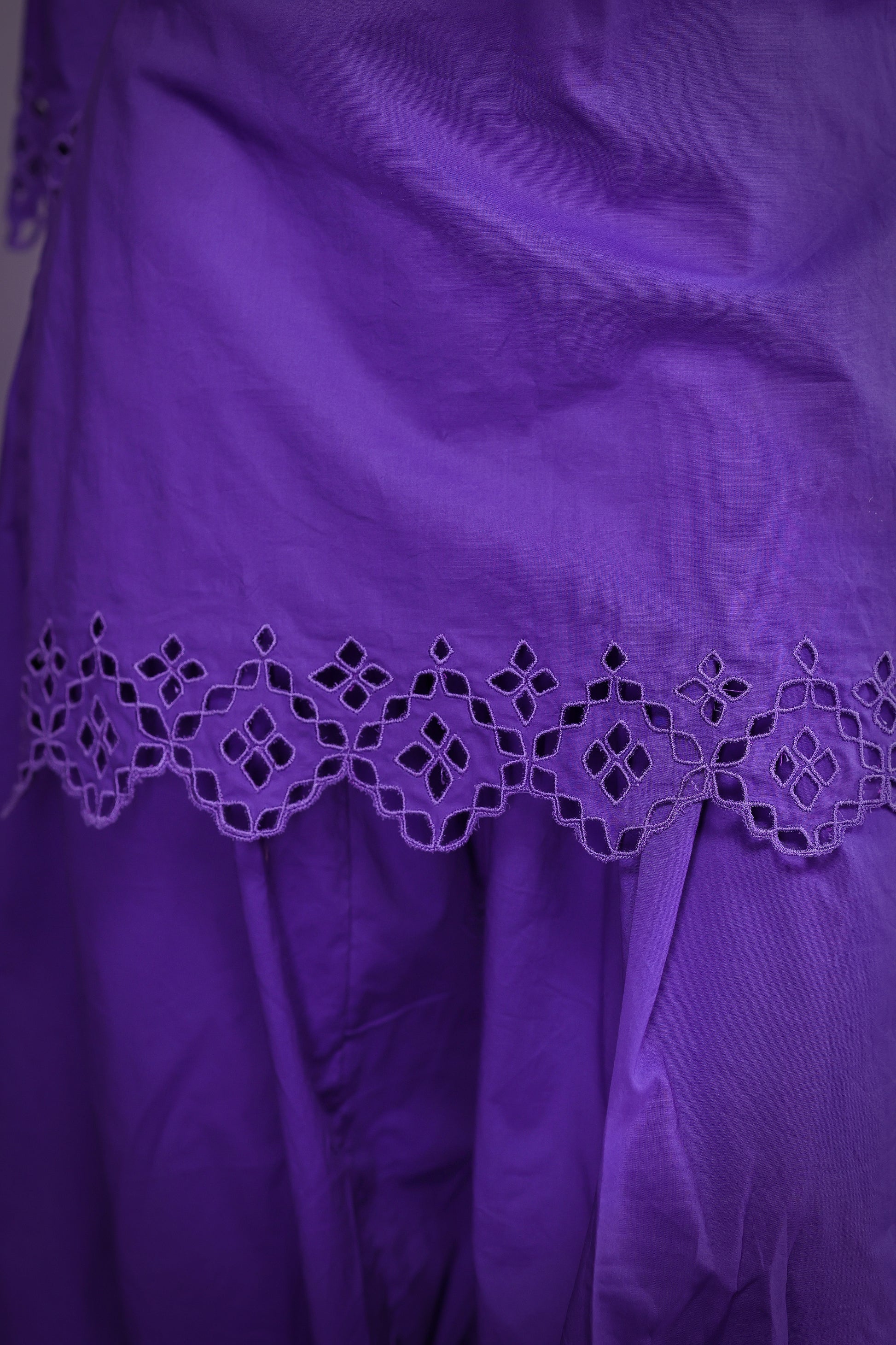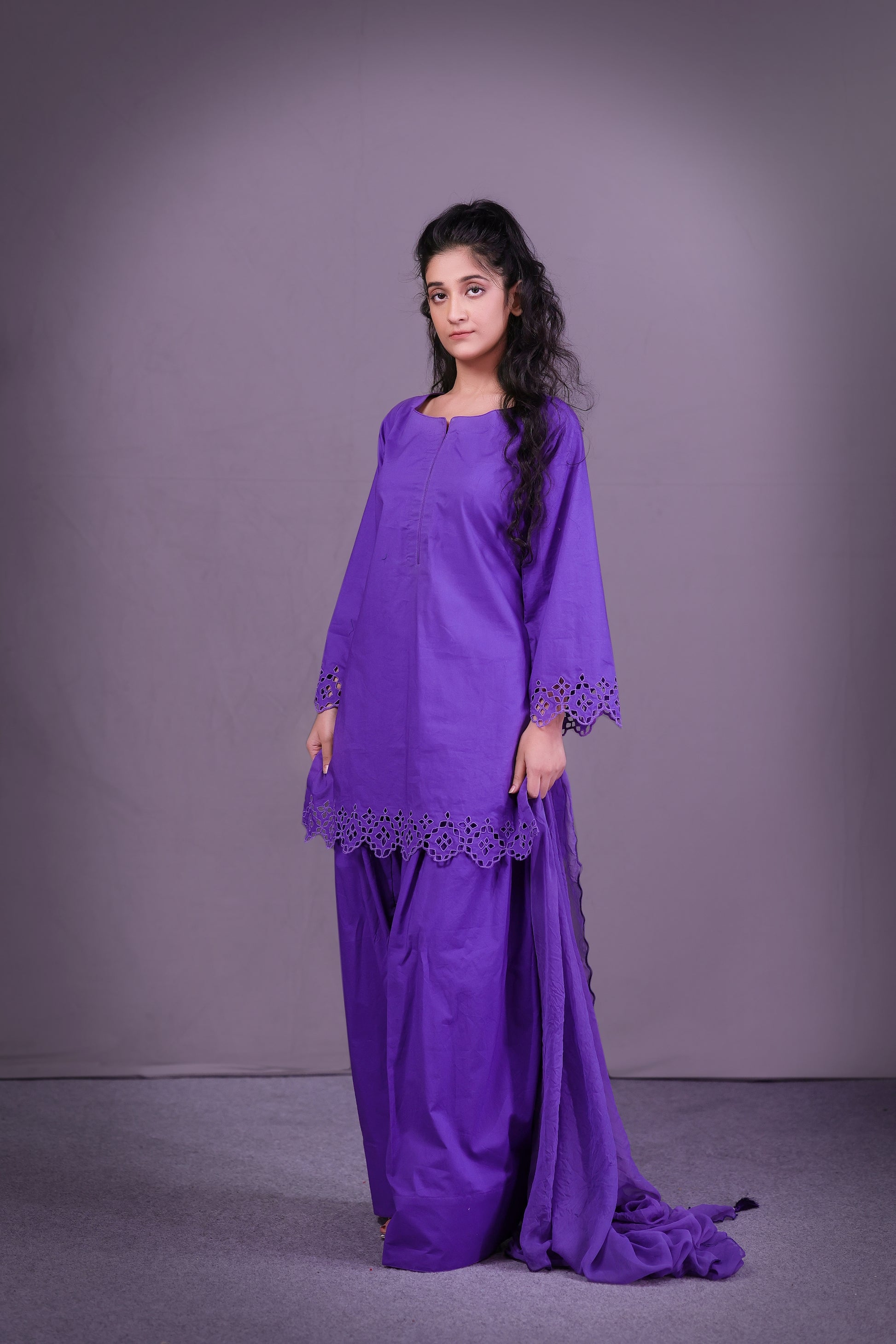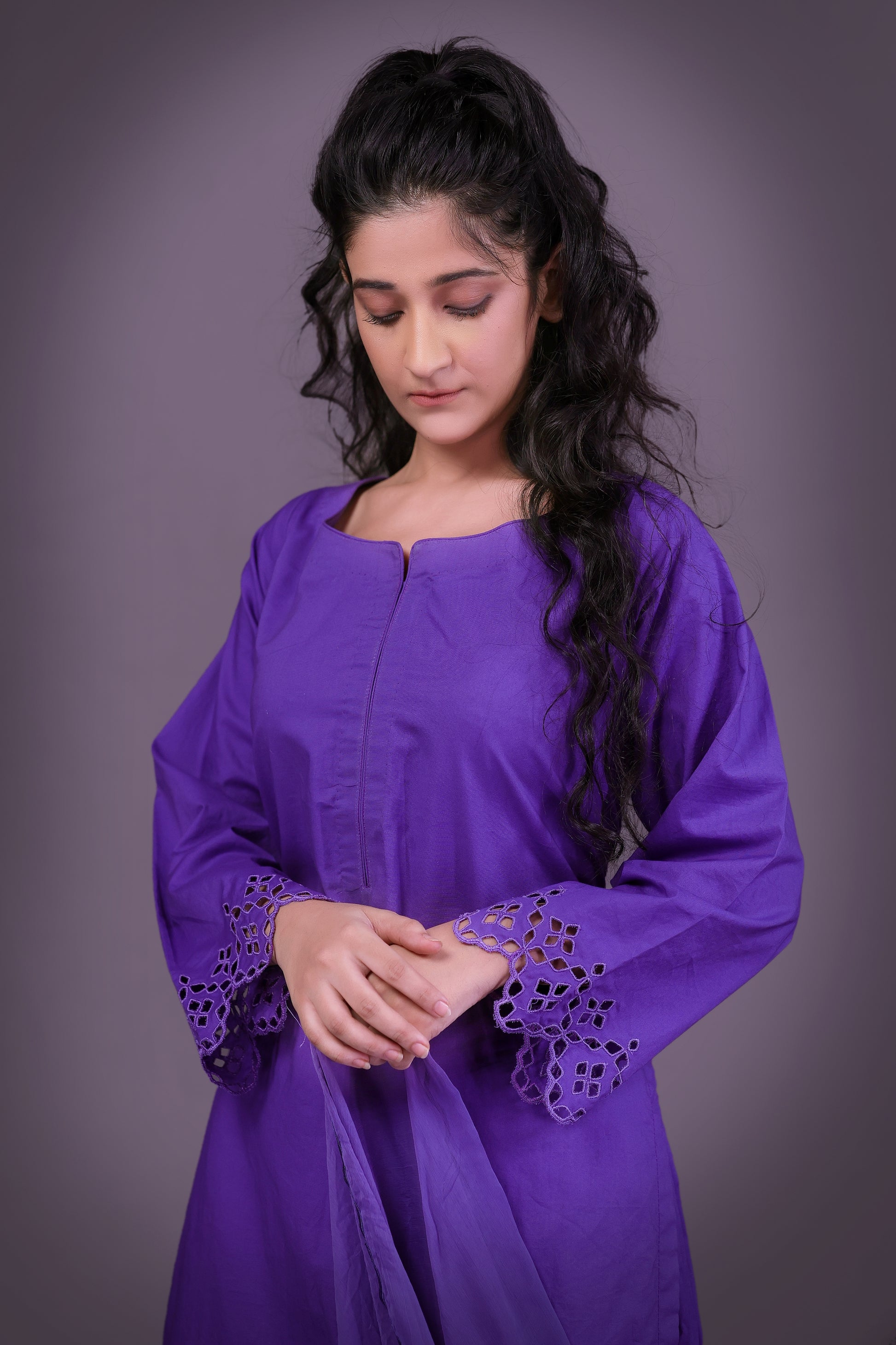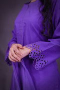 A deep violet 2 piece in Luxe Silk inspired by Sassi Punhu with geometric cutwork on daman and sleeves. The wide leg shalwar adds graceful volume. A clean and structured silhouette designed for elegance in summer.