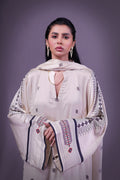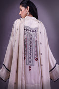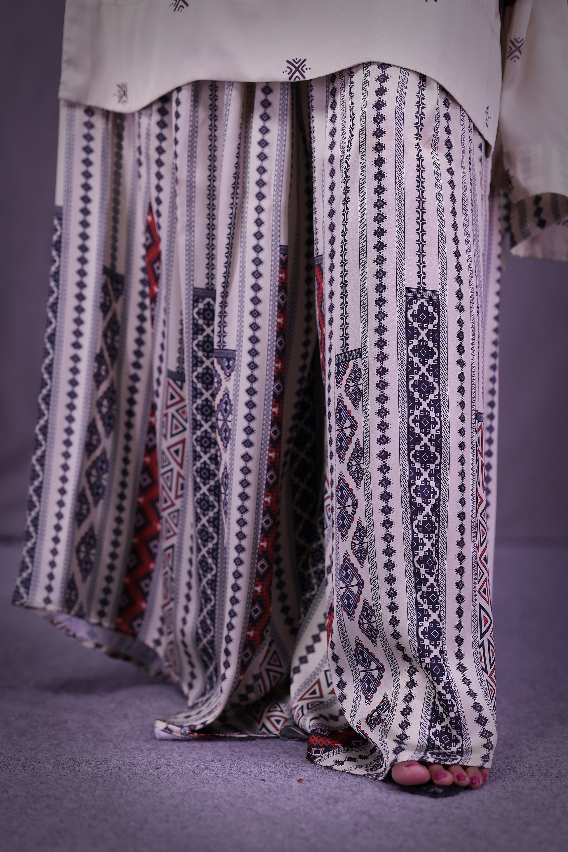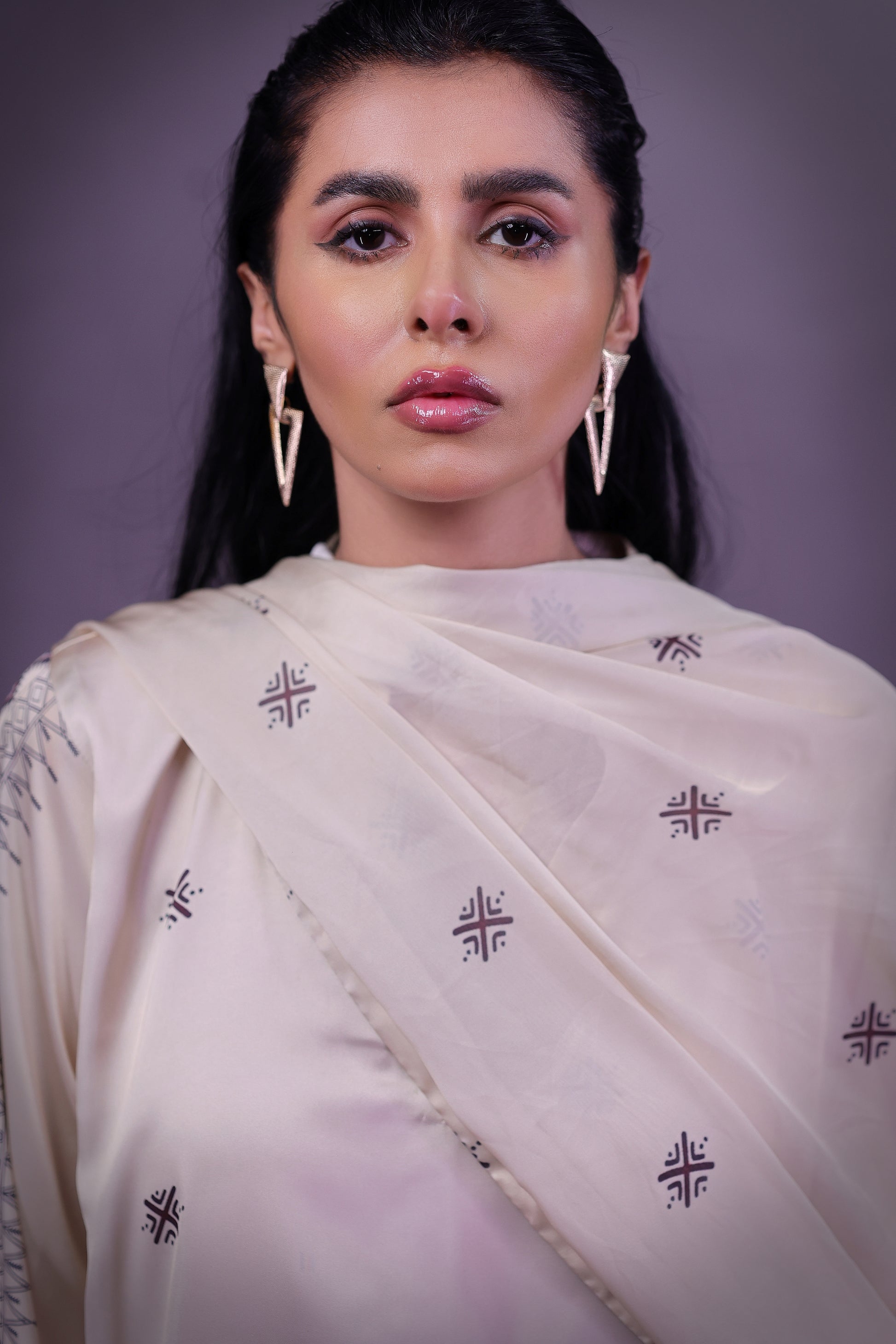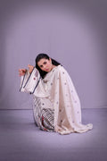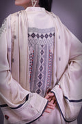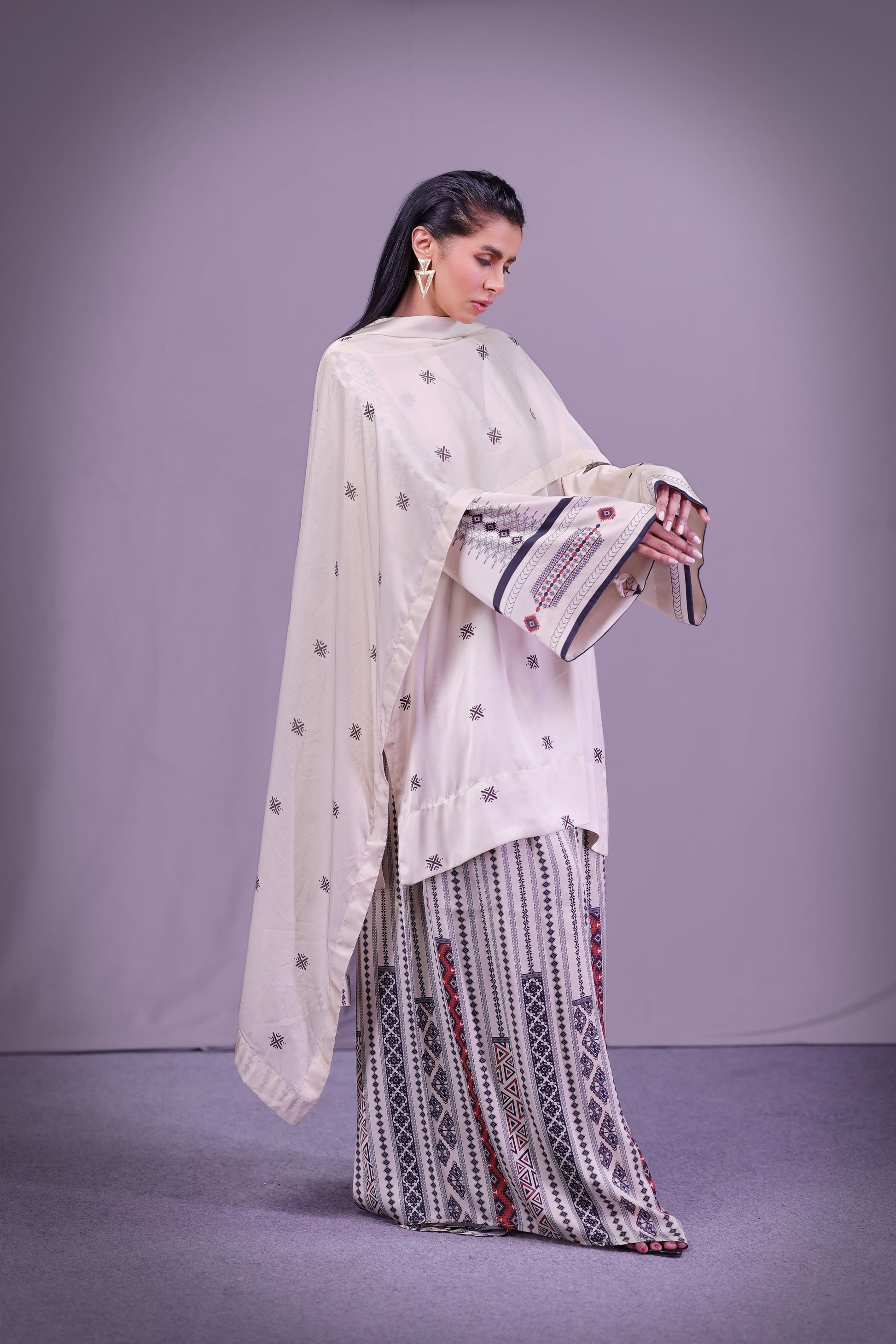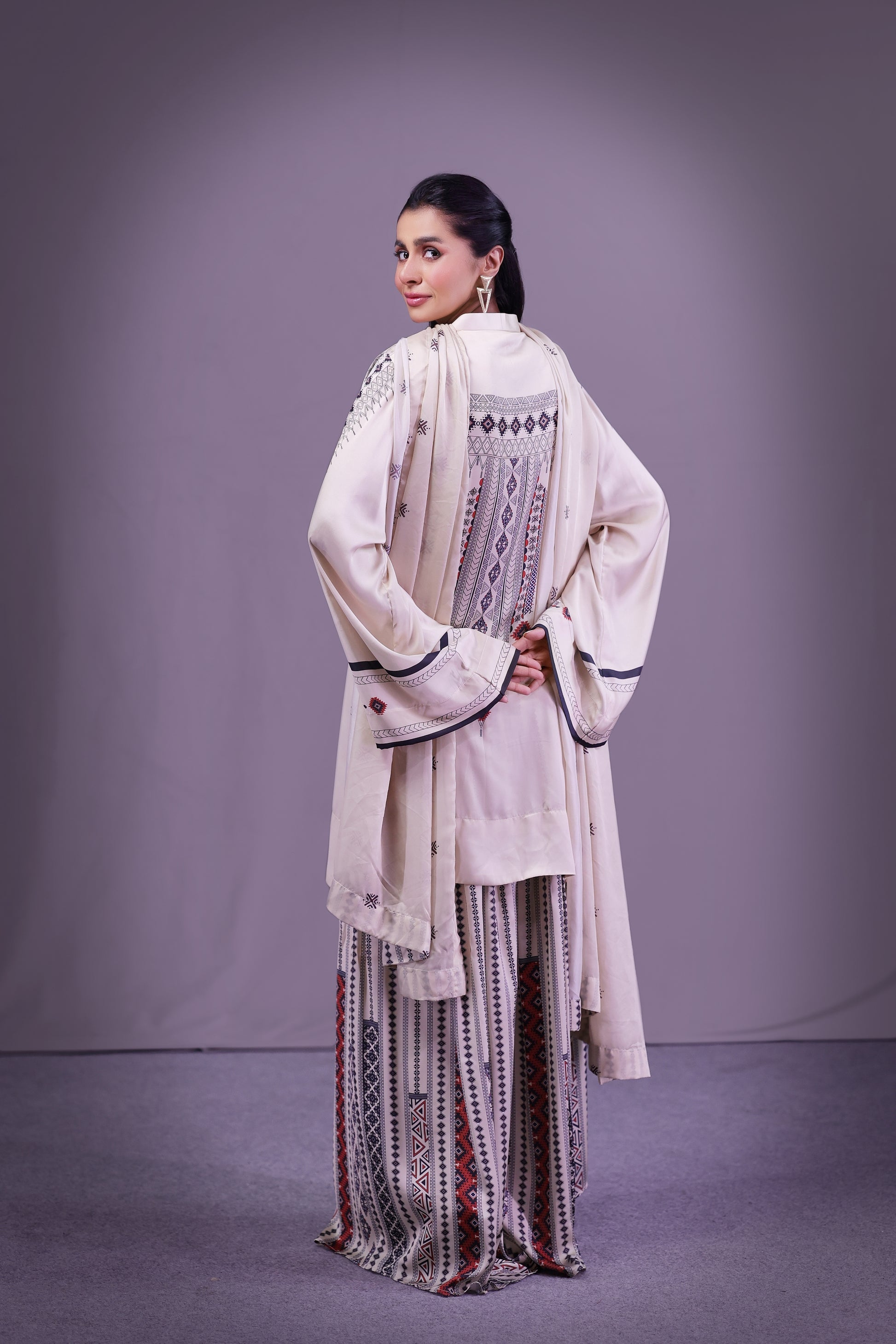This soft Beige three-piece in Pure Luxe Lawn is inspired by Sassi and Punhu celebrating Sindhi culture with geometric patterns on a Medium-length shirt and a unique skirt-style trouser. Paired with a printed Medium Silk Dupatta it captures heritage in a modern silhouette.