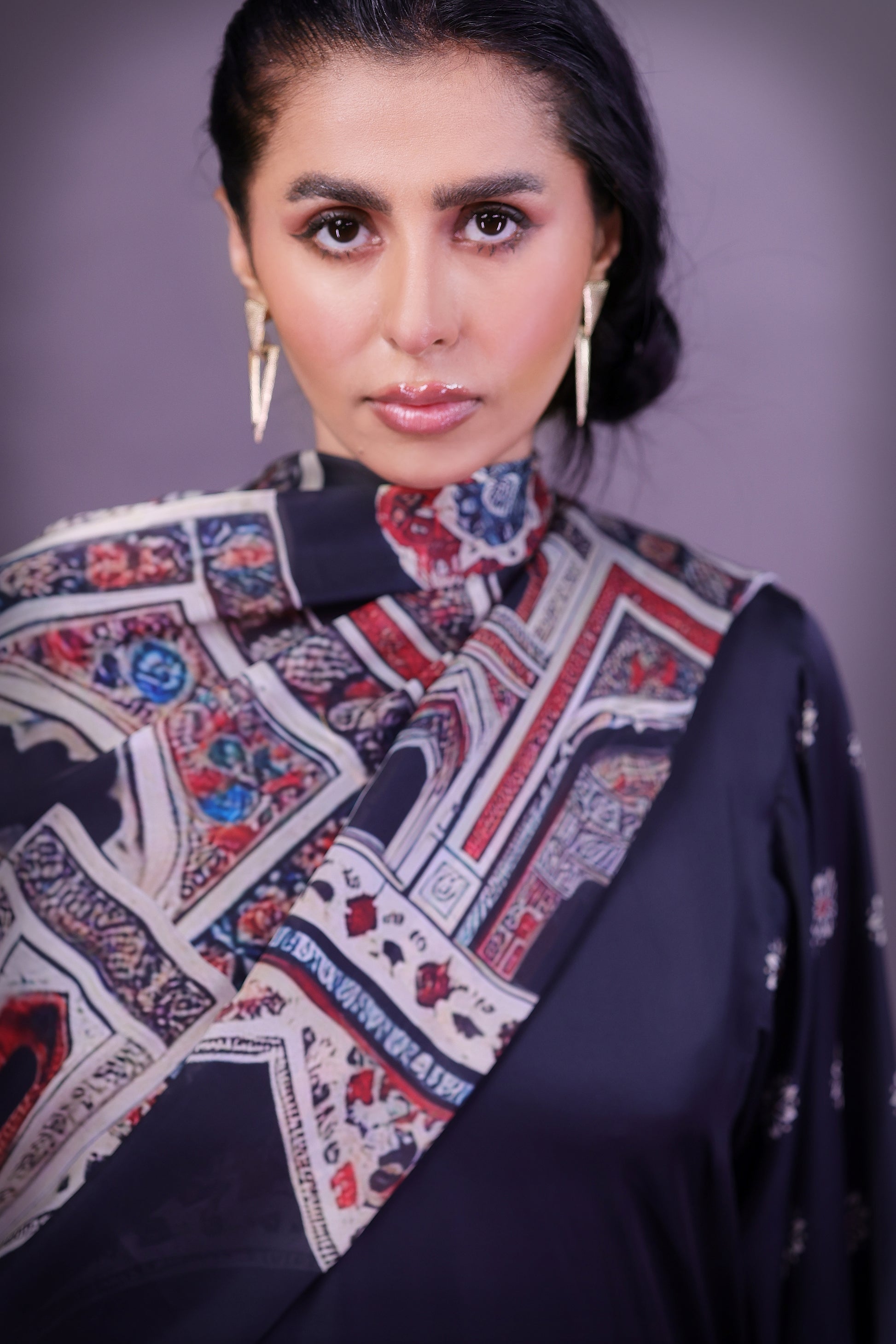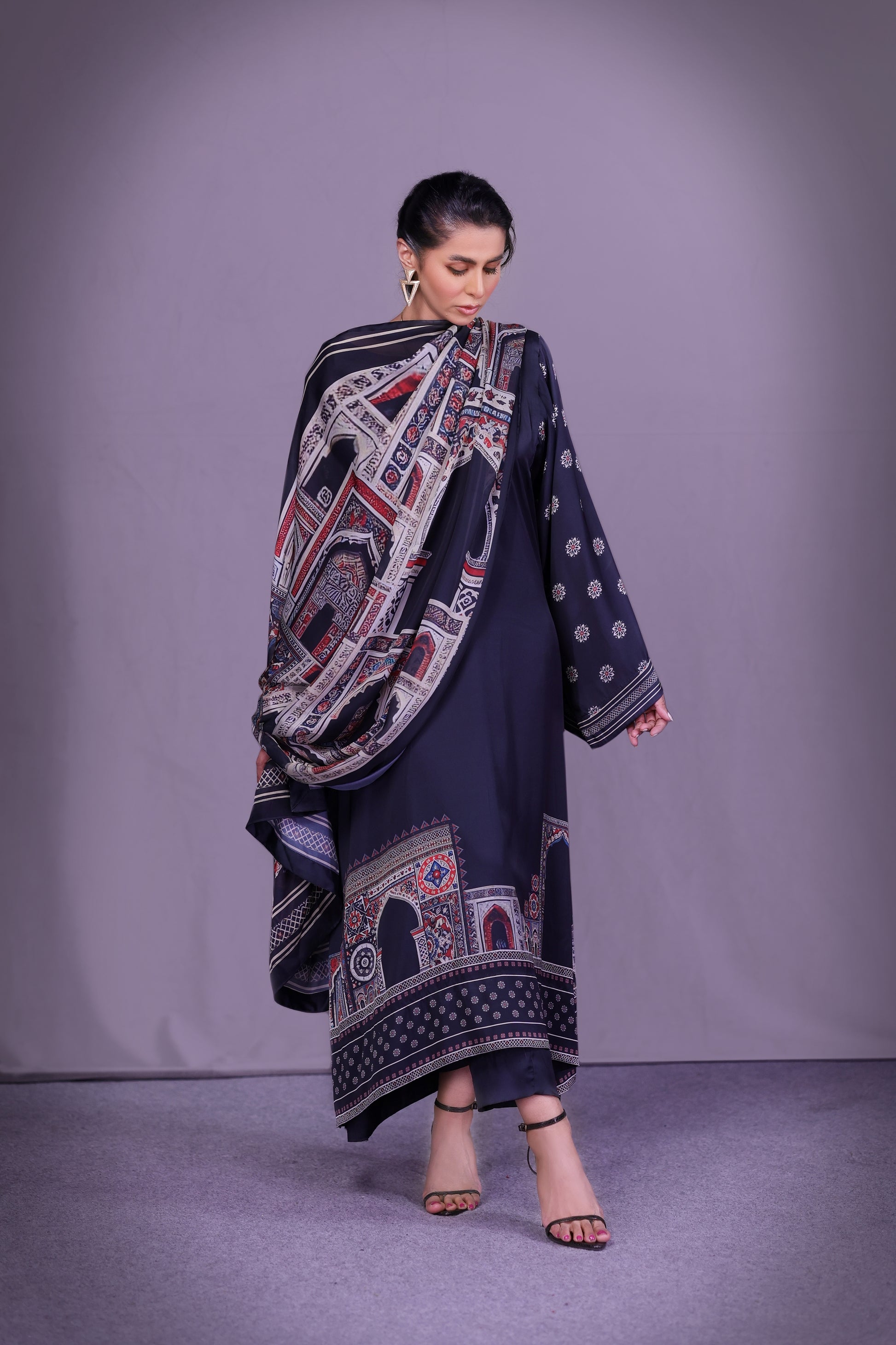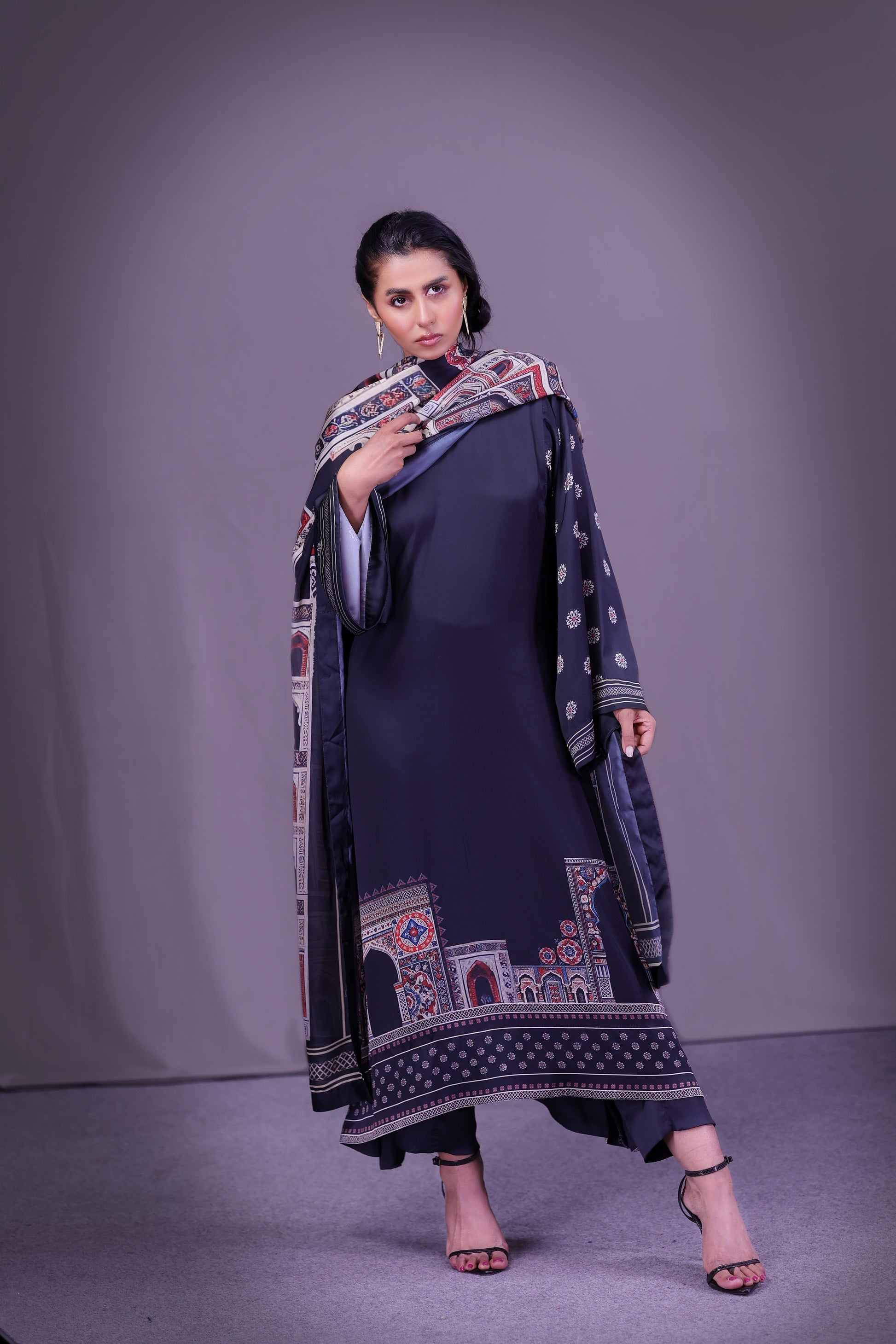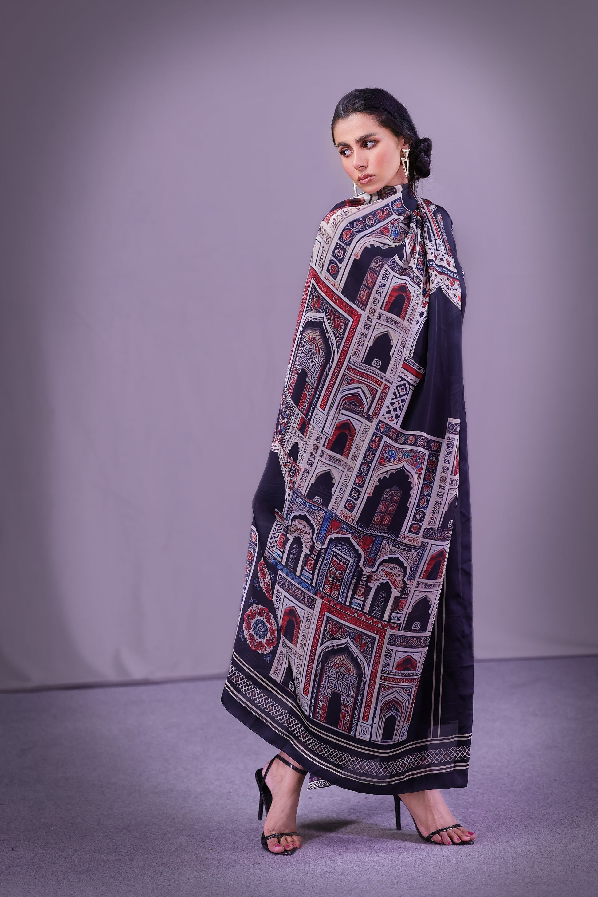 This midnight black long frock in Pure Luxe Silk is inspired by Mughal-era architecture with arches and intricate motifs telling stories of timeless artistry. Paired with a printed medium silk dupatta and a straight pant it captures heritage with quiet elegance.