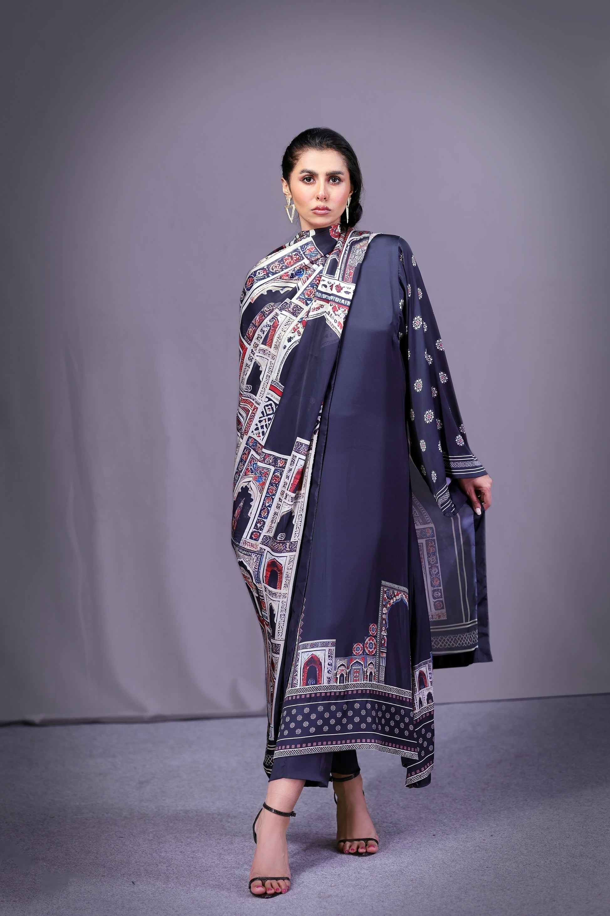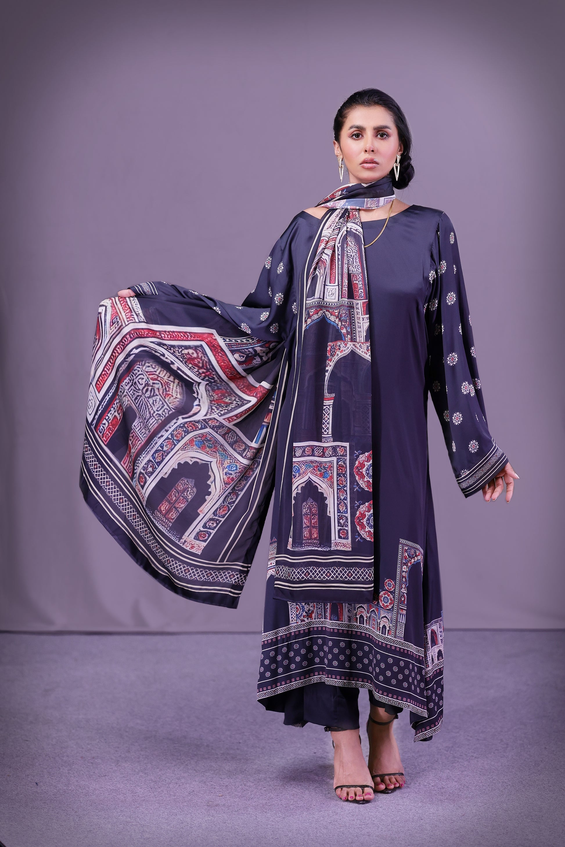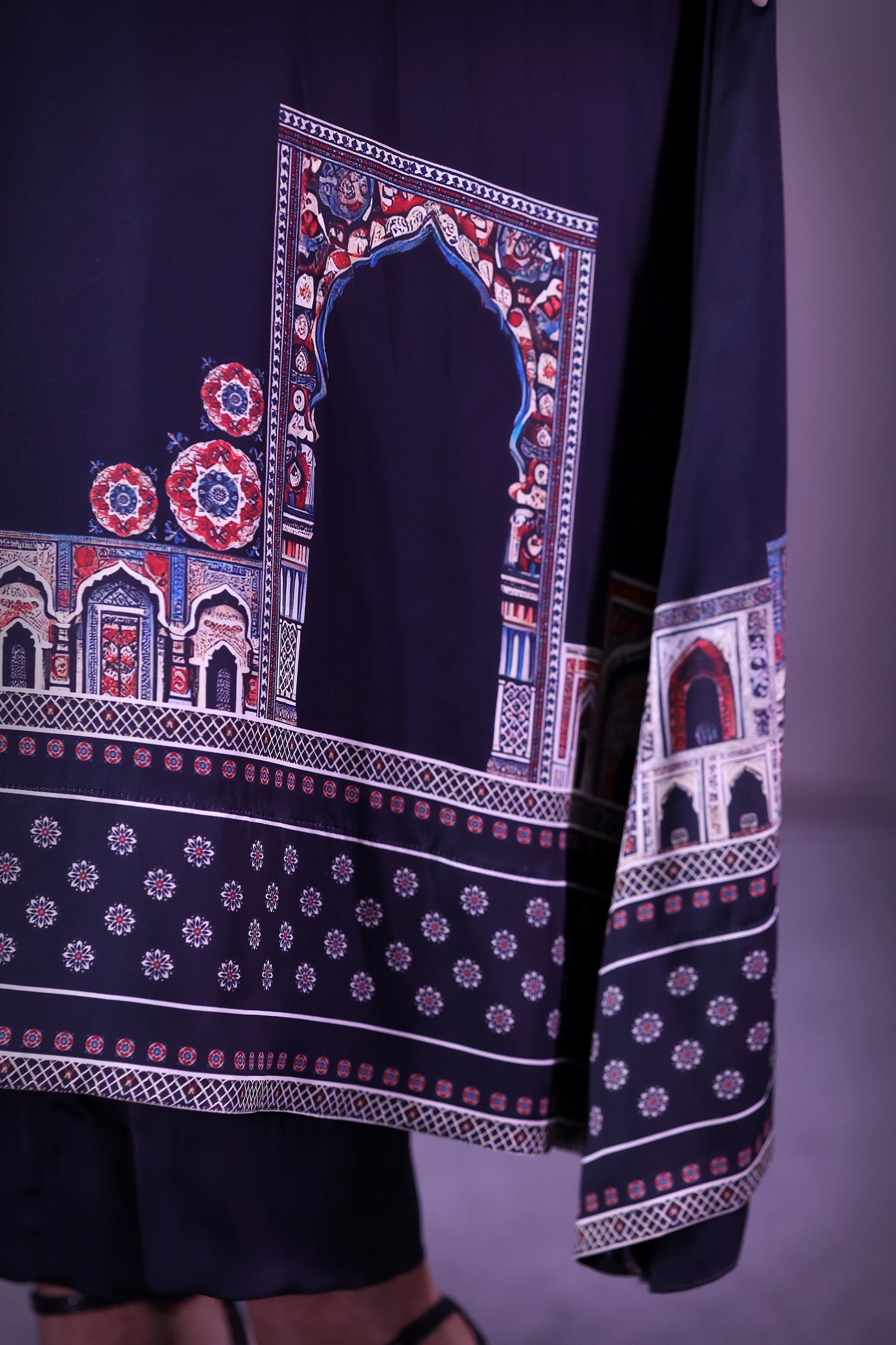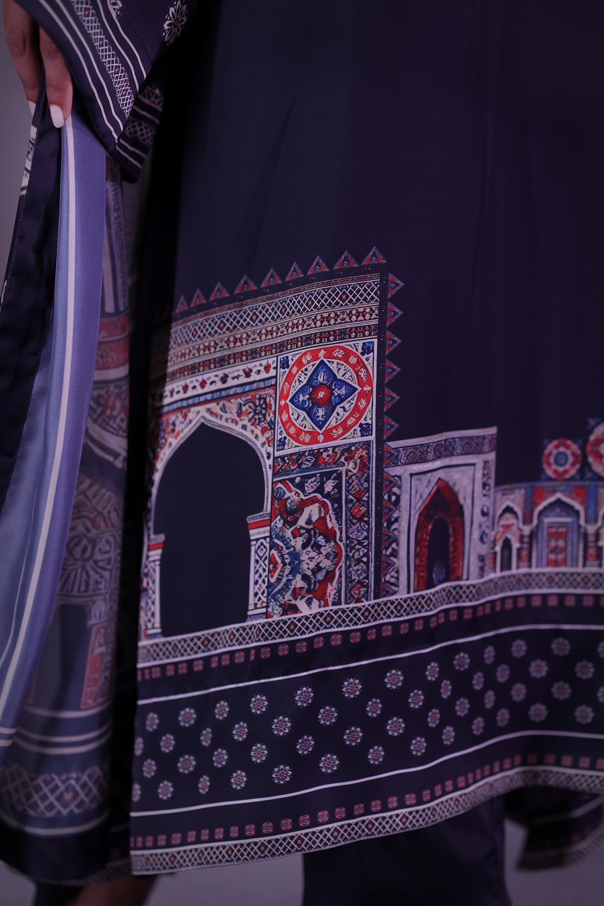 This midnight black long frock in Pure Luxe Silk is inspired by Mughal-era architecture with arches and intricate motifs telling stories of timeless artistry. Paired with a printed medium silk dupatta and a straight pant it captures heritage with quiet elegance.